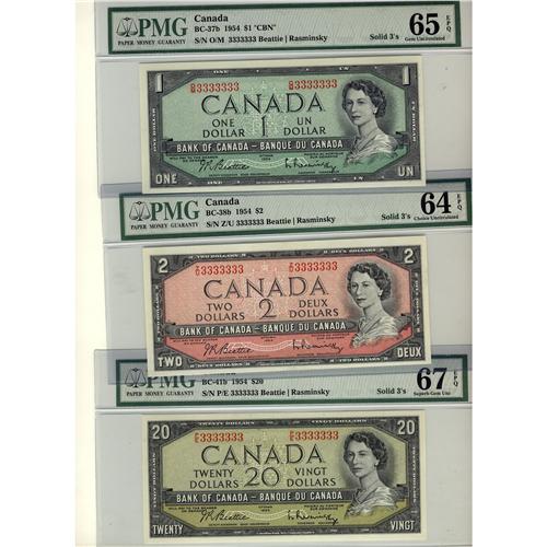 BC-37b $1 Gem UNC65, BC-38b $2 CH UNC64 and BC-41b $20 Superb Gem UNC67. Lot of 3 notes all EPQ with solid serial numbers #3333333