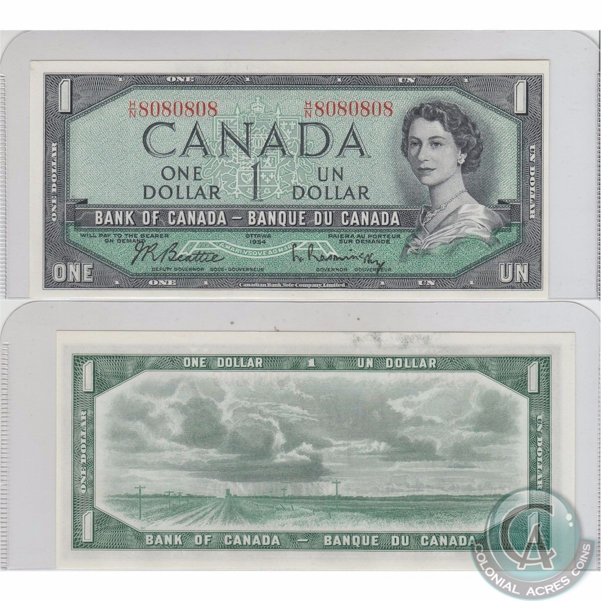 BC-37b. 1954 Bank of Canada $1, Beattie-Rasminsky, 2 digit RADAR/ROTATOR, S/N: H/N8080808 in AU-UNC Condition.