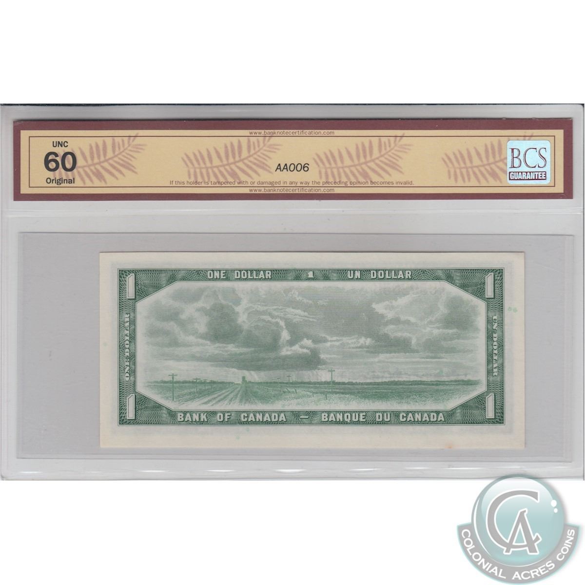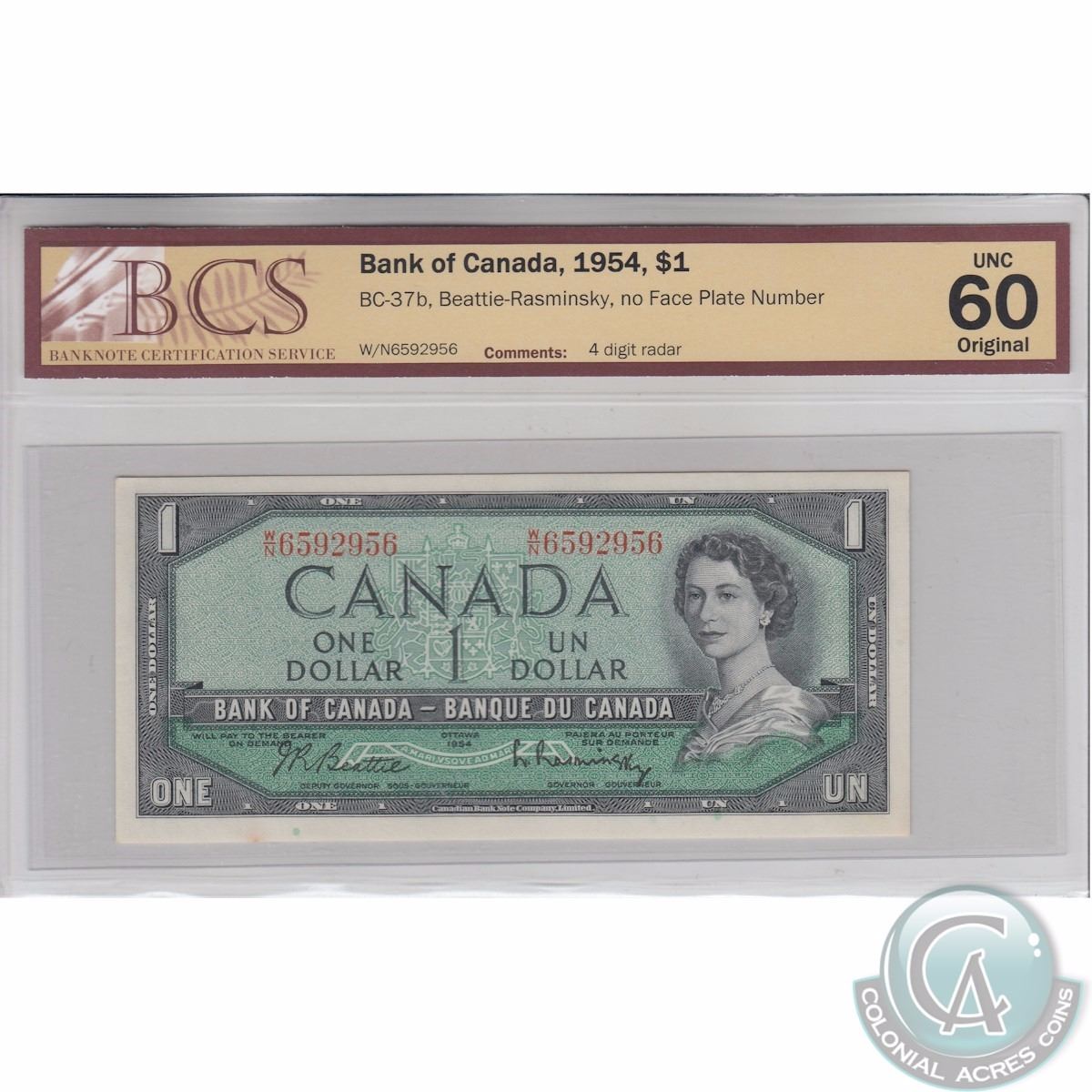 BC-37b. 1954 Bank of Canada $1, Beattie-Rasminsky, W/N with no Face Plate Number, 4 digit RADAR, S/N: W/N6592956, BCS Certified UNC-60, Original. A scarce variety with a scarce serial number.