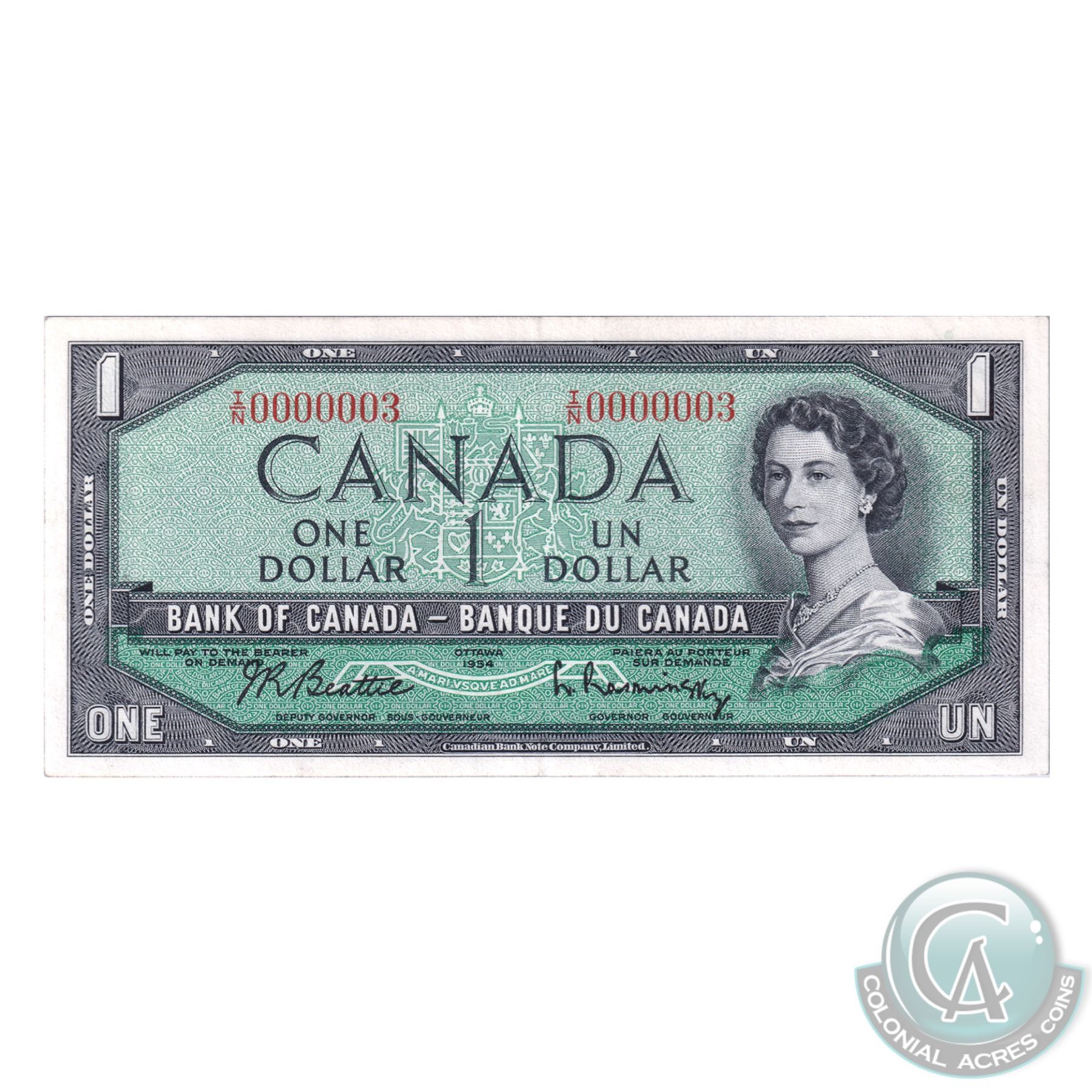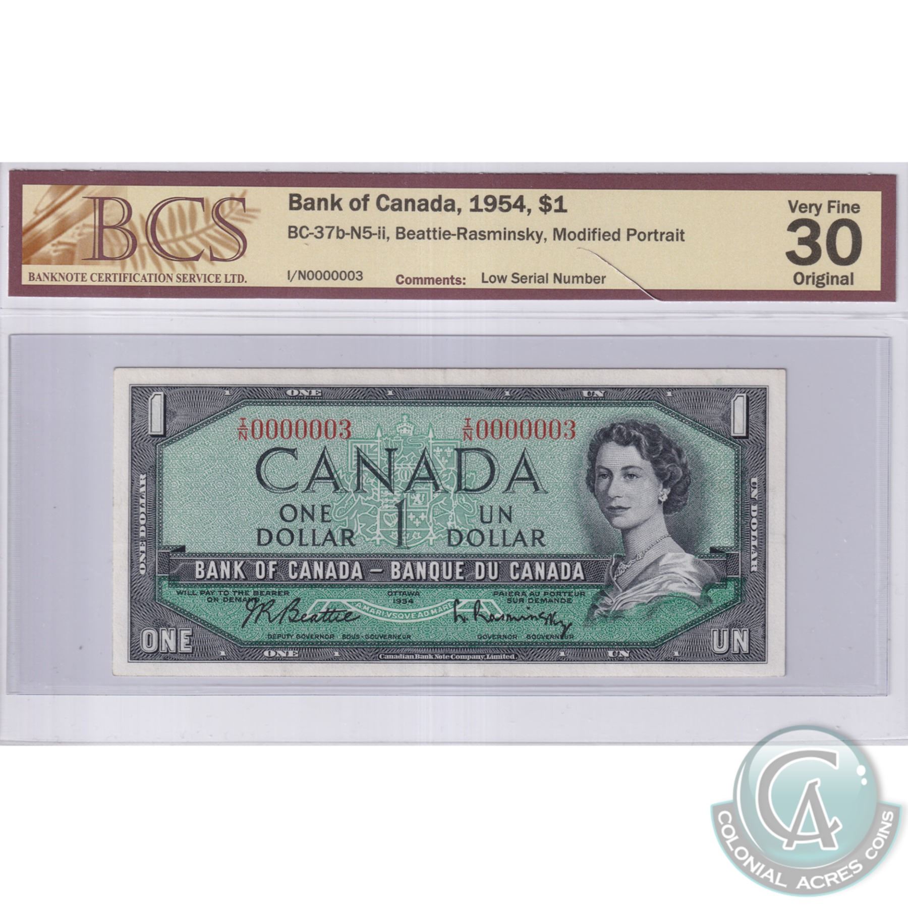 BC-37b-N5-ii 1954 Bank of Canada $1, Beattie-Rasminsky, Low Serial Number I/N0000003, BCS Certified VF-30 Original