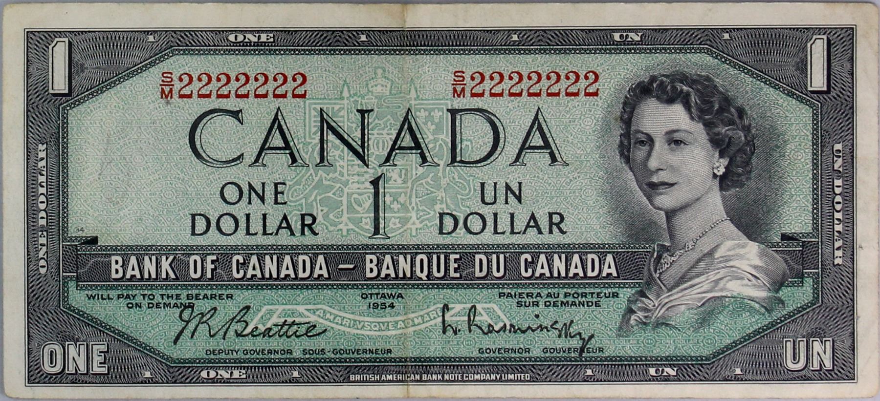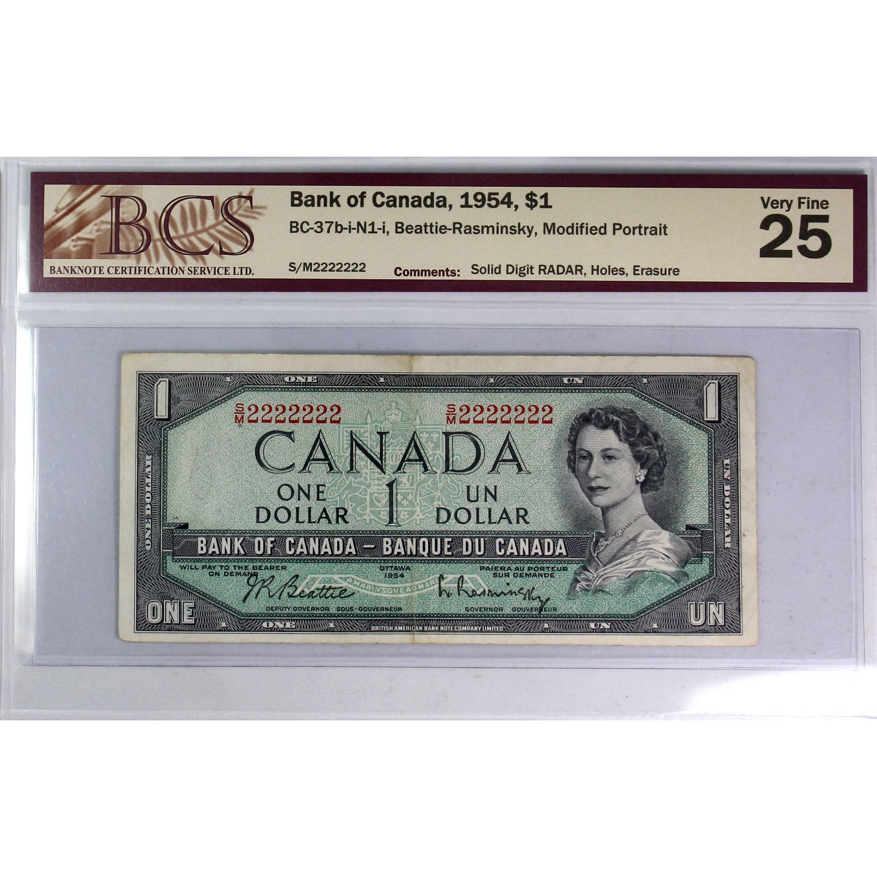 BC-37b-i-N1-i 1954 $1 Solid 2's S/M2222222 BCS VF25 Beattie-Rasminsky (2 small staple holes and erasure)
