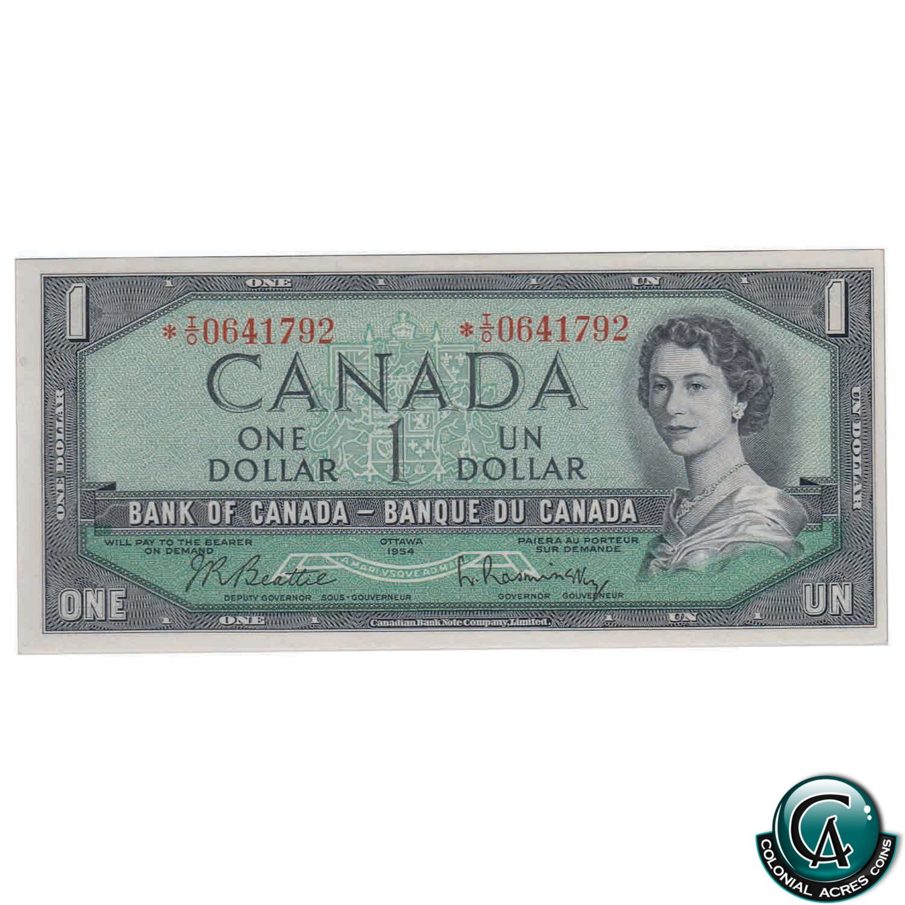 BC-37bA 1954 Bank of Canada $1, Beattie-Rasminsky, Replacement, *IO 0641792, Modified Portrait BCS CUNC-64 Original