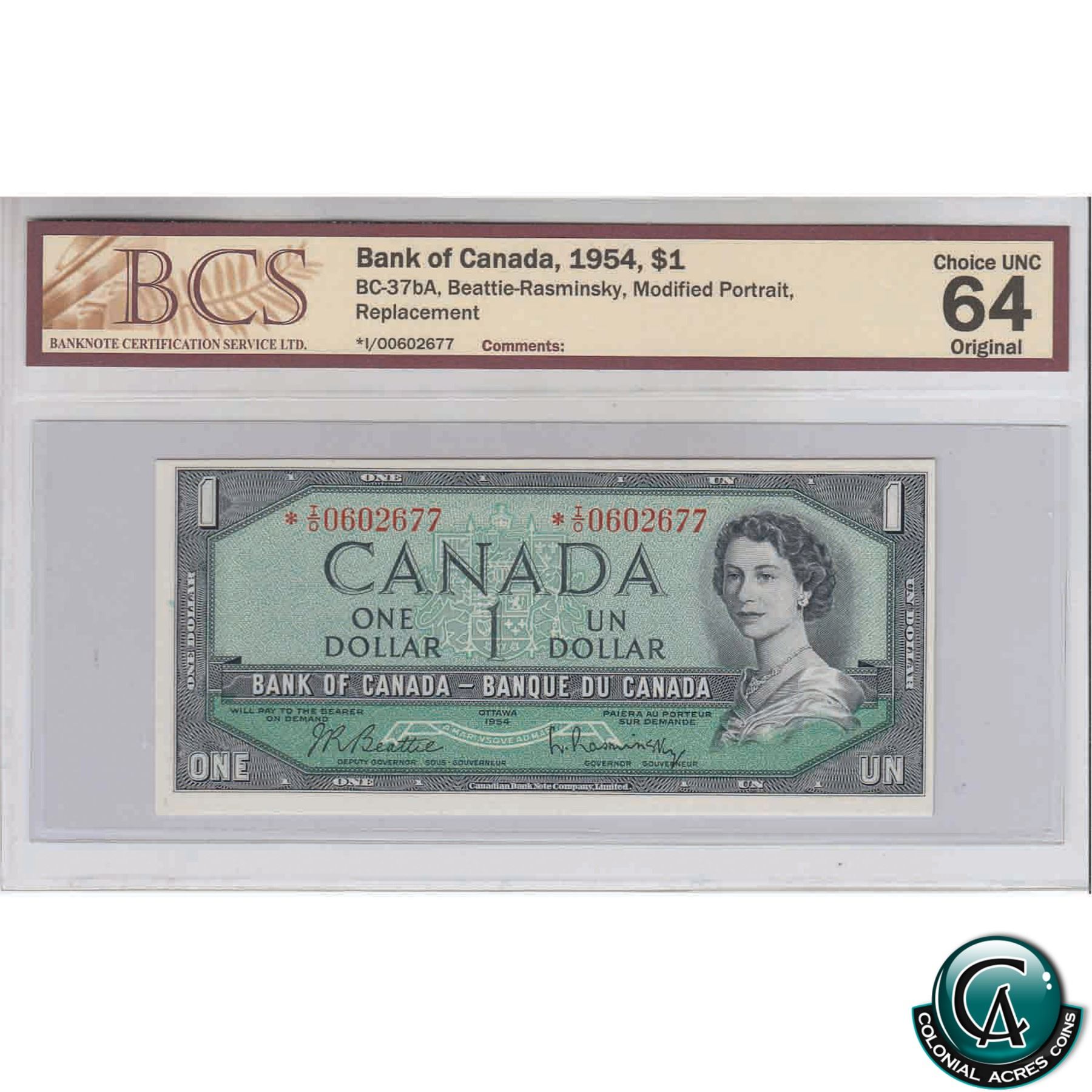 BC-37bA 1954 Bank of Canada $1, Beattie-rasminsky, Modified Portrait, Replacement, *I/O 0602677, BCS CUNC-64 Original