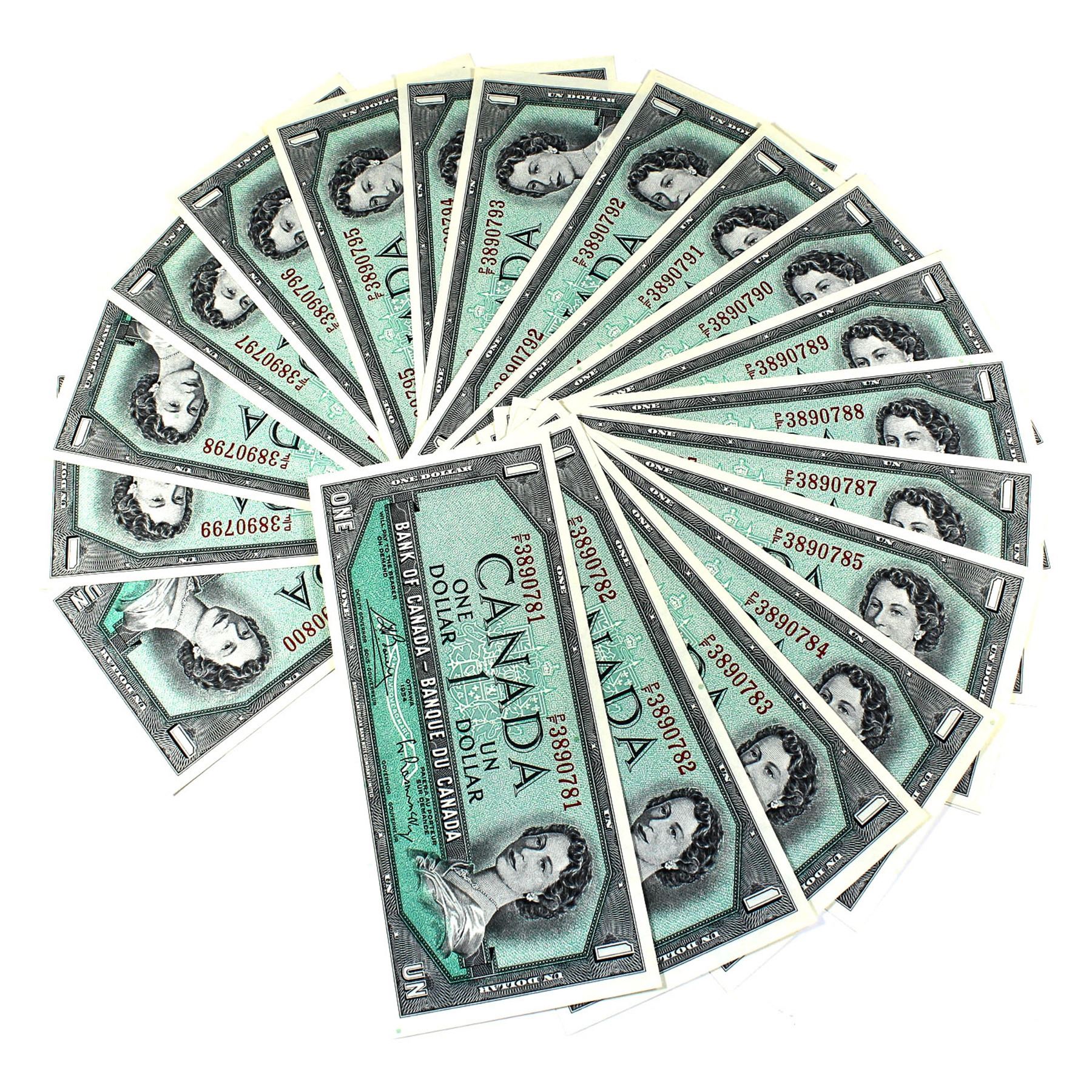 BC-37c Lot of 20 Sequential 1954 Bank of Canada Modified $1 Bouey-Rasminsky, S/N: P/F3890781-800.
