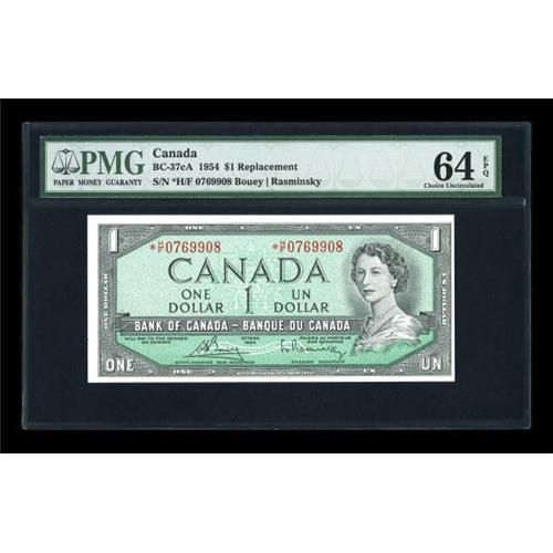 <B>BC-37cA $1 1954</B></I><BR> A nice example of the scarcer H/F block Bouey-Rasminsky replacement. PMG <B>Choice Uncirculated 64 EPQ.</B></I><BR><I>From The Thomas M. Flynn Collection</B></I><BR><BR><b>Shipping:</b> Coins & Currency (<a target="_blank" href="http://www.heritageauctions.com/common/shipping.php">view shipping information</a>)
