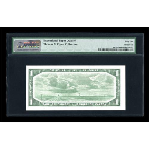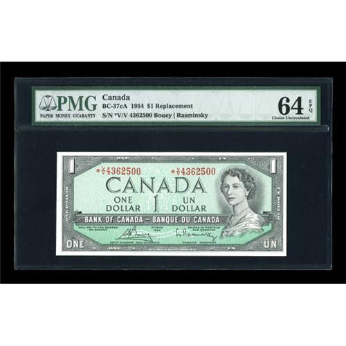 <B>BC-37cA $1 V/V Block Replacement 1954</B></I><BR> This is one of the very rarest replacement notes, with the Charlton reference indicating a printing of only about 360 pieces. According to Charlton, the existence of only fourteen of these asterisk V/V block notes have been verified. Few if any are likely to be nicer than this strikingly original specimen from the Flynn collection, which has been graded <B>Choice Uncirculated 64 EPQ </B></I>by PMG. Any estimate for a note of this rarity is simply a surmise, but it would not surprise us at all to see bidding for this piece easily exceed our likely conservative estimate of...<BR><I>From The Thomas M. Flynn Collection</B></I><BR><BR><b>Shipping:</b> Coins & Currency (<a target="_blank" href="http://www.heritageauctions.com/common/shipping.php">view shipping information</a>)