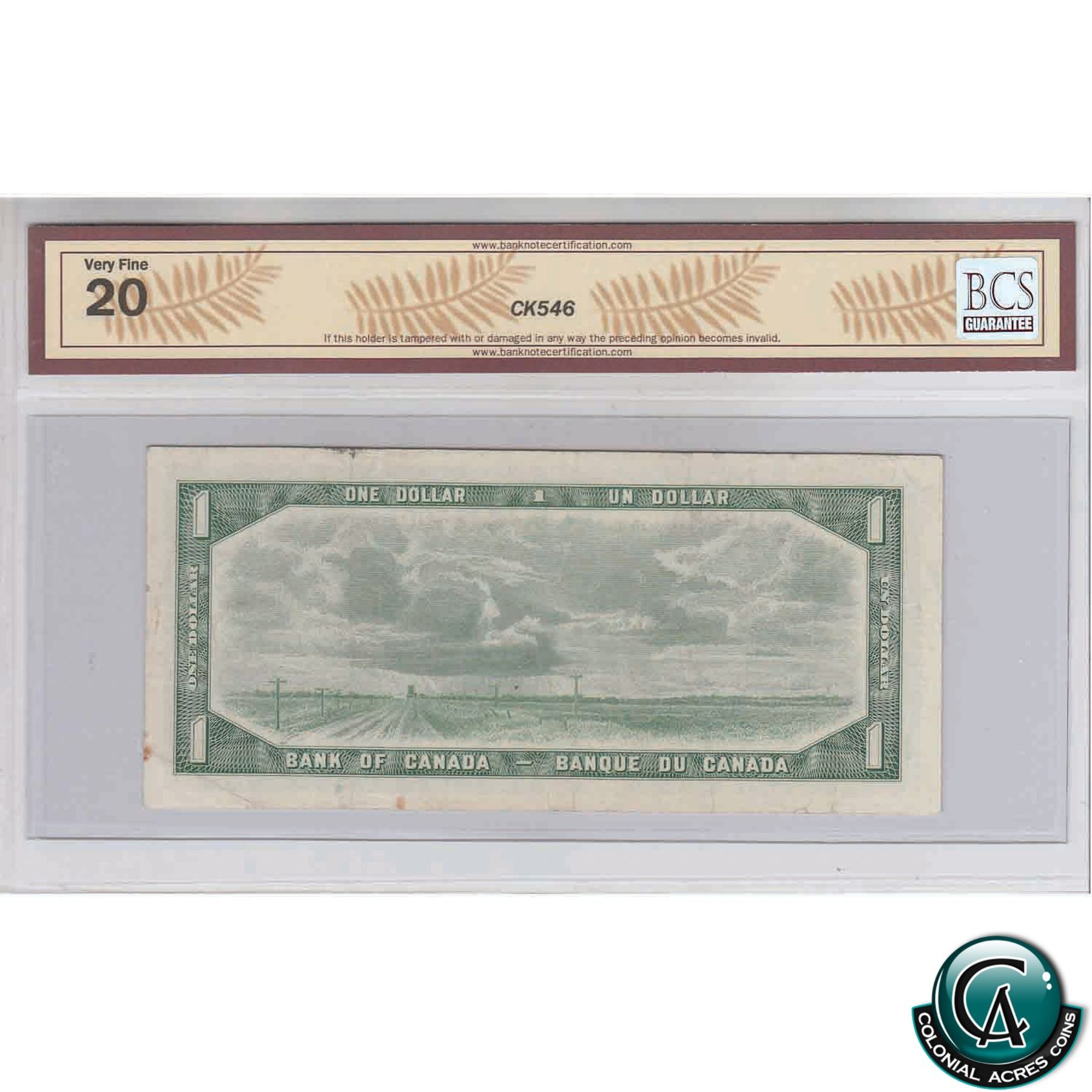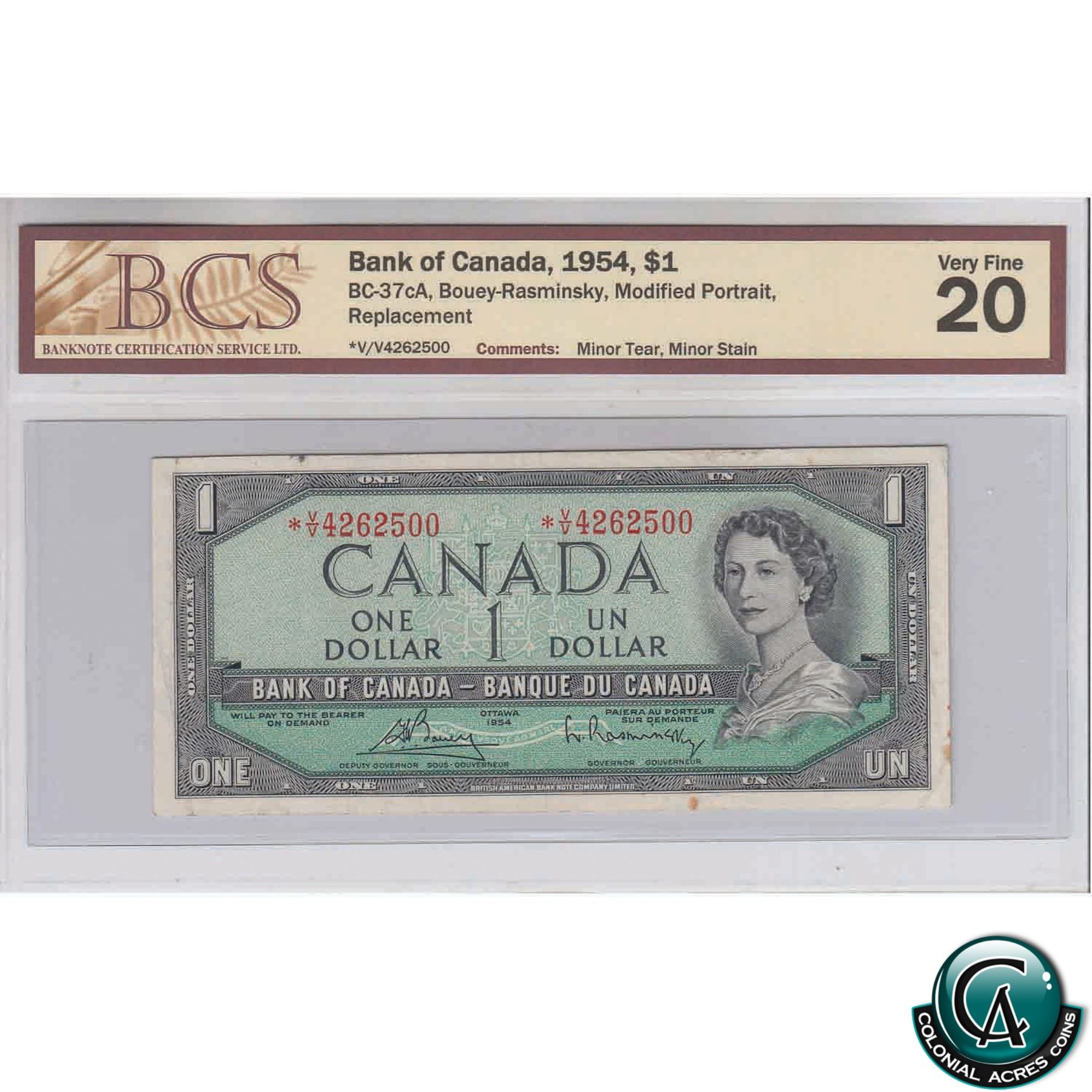 BC-37cA 1954 Bank of Canada $1, Bouey-Rasminsky, Replacement, *V/V4262500, Modified Portrait, BCS VF-20 (Minor tear, minor stain).