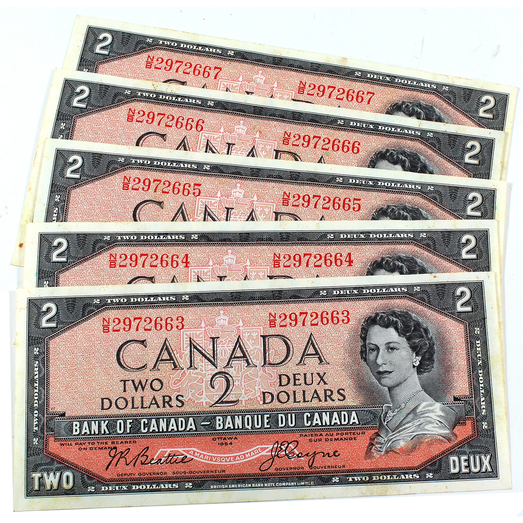 BC-38a 1954 $2 Consecutive UNC Beattie-Coyne SN: N/B2972663 to  67. 5pcs