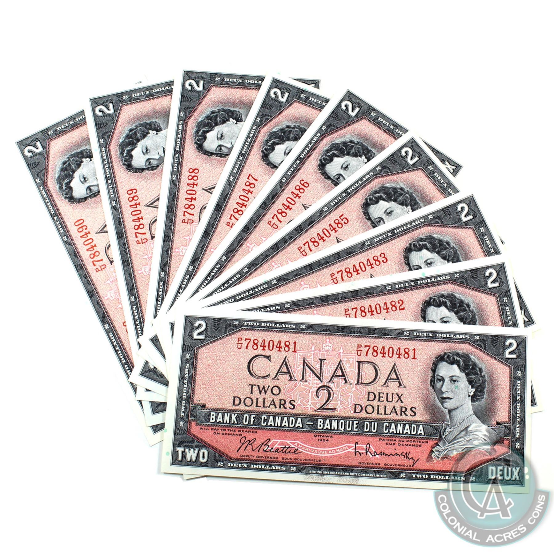 BC-38b 1954 Bank of Canada $2. 10 notes in sequence with one Radar (P/U 7840487) Beattie-Rasminsky, S/N: P/U 7840481 to 7840490. 10pcs