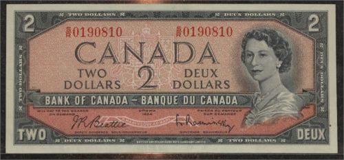 BC-38bT 1954 $2 Beattie-Rasminski S/R0190810 1954 $2 TEST NOTE. Uncirculated.