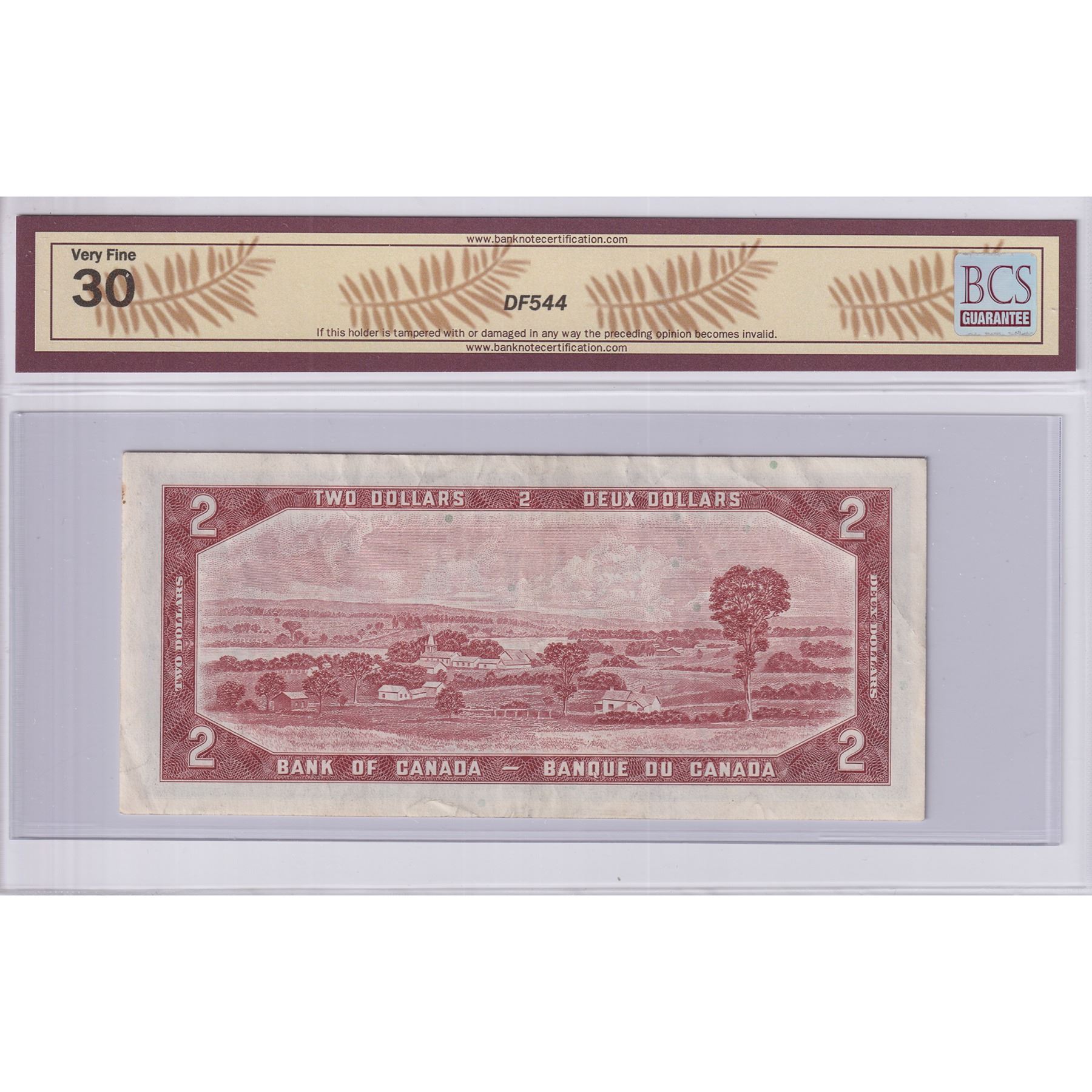 BC-38bT 1954 Bank of Canada Modified $2 Test Note, Beattie-Rasminsky S/N: S/R1351828, BCS Certified VF-30 (minor stain)