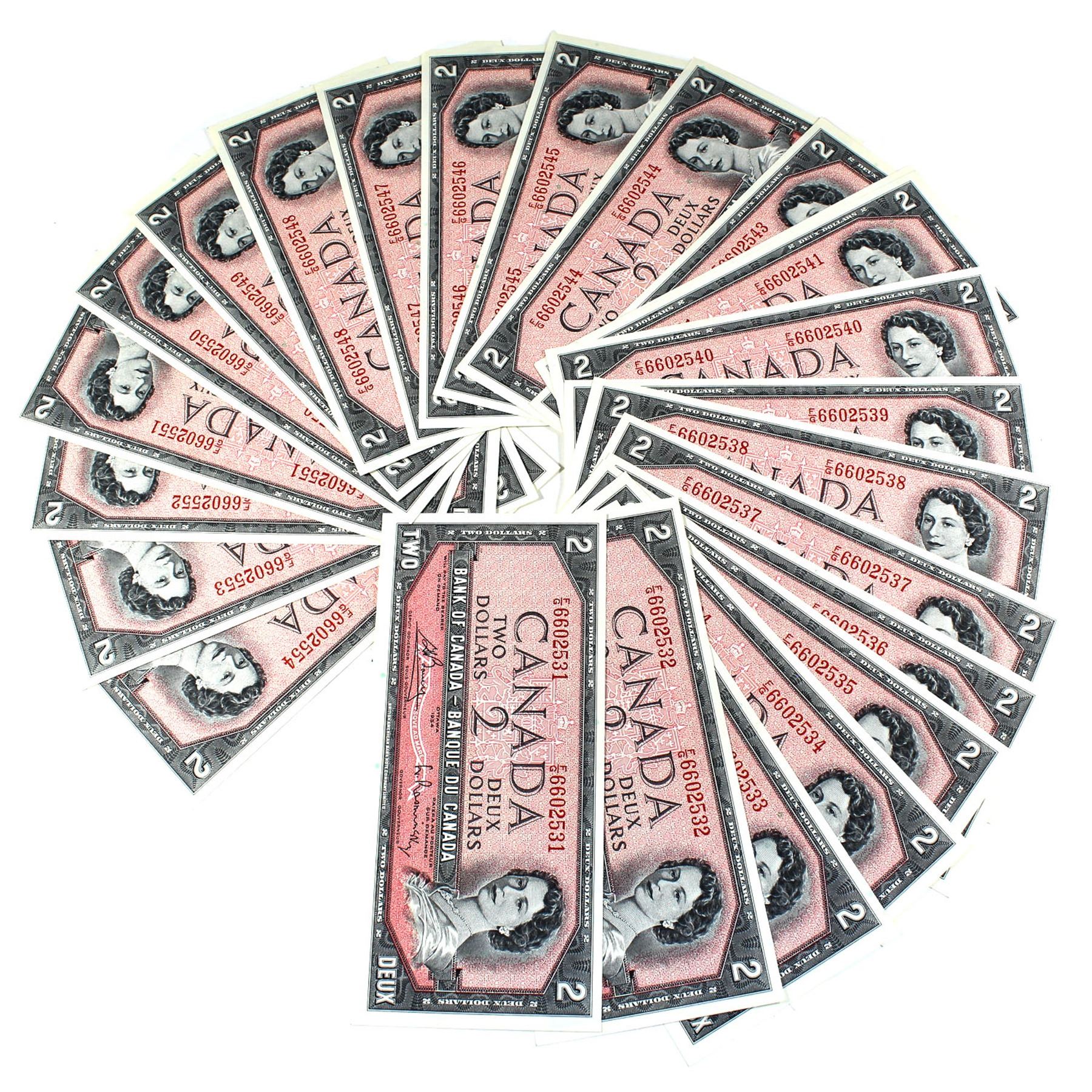BC-38c Lot of 24 Sequential 1954 Bank of Canada Modified $2 Bouey-Rasminsky, S/N:F/G6602531-554.