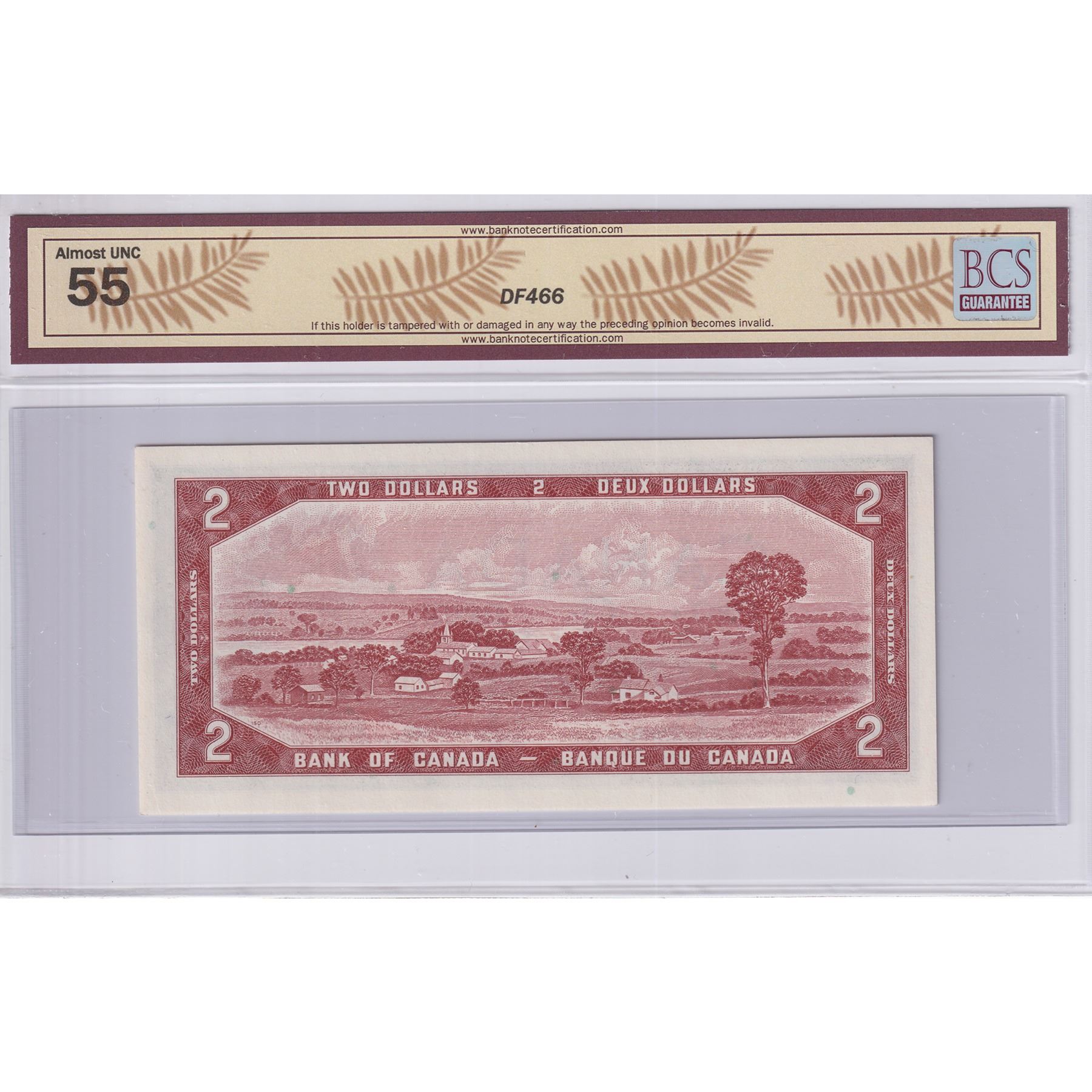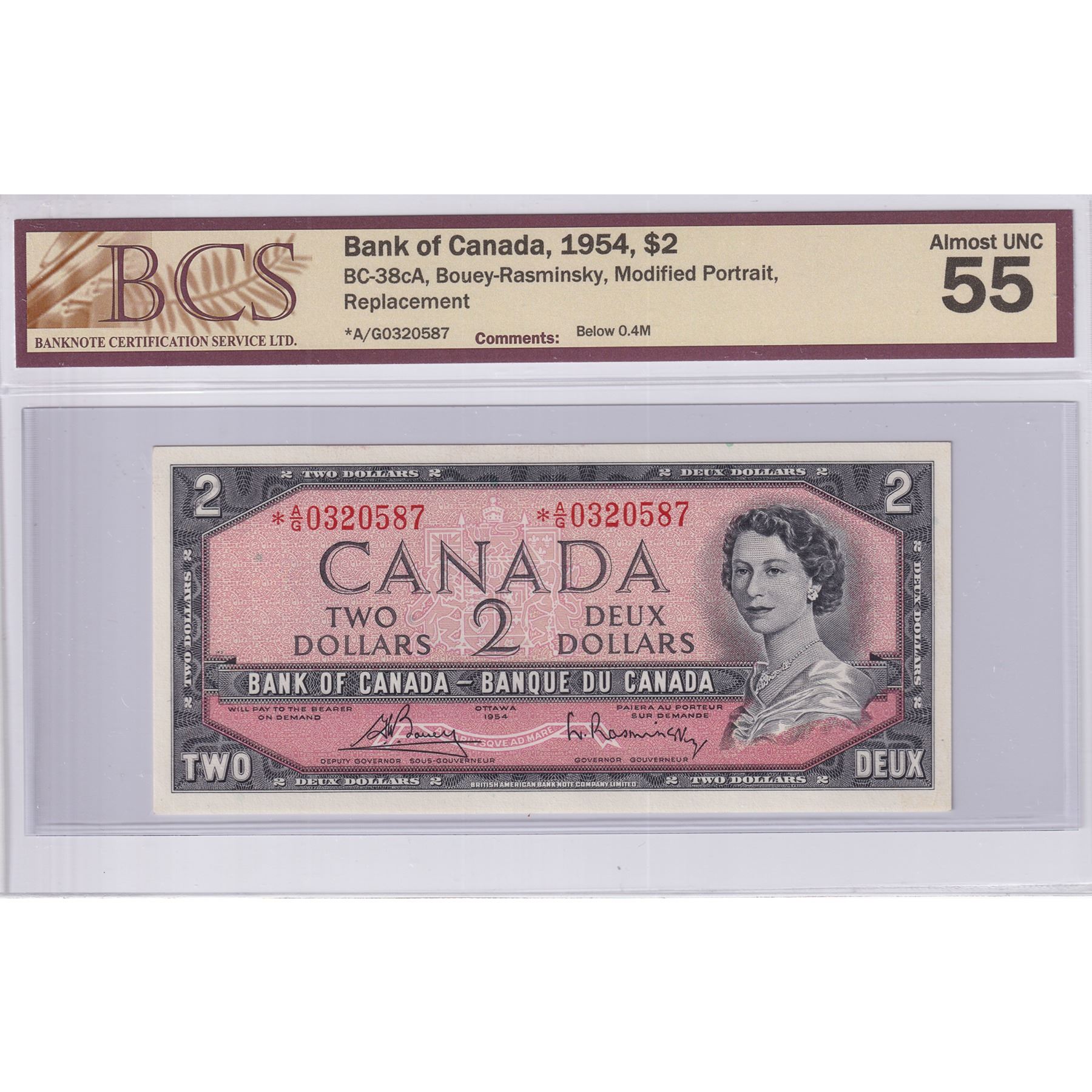 BC-38cA 1954 Bank of Canada Modified Replacement $2, Bouey-Rasminsky S/N: *A/G0320587, BCS Certified AU-55