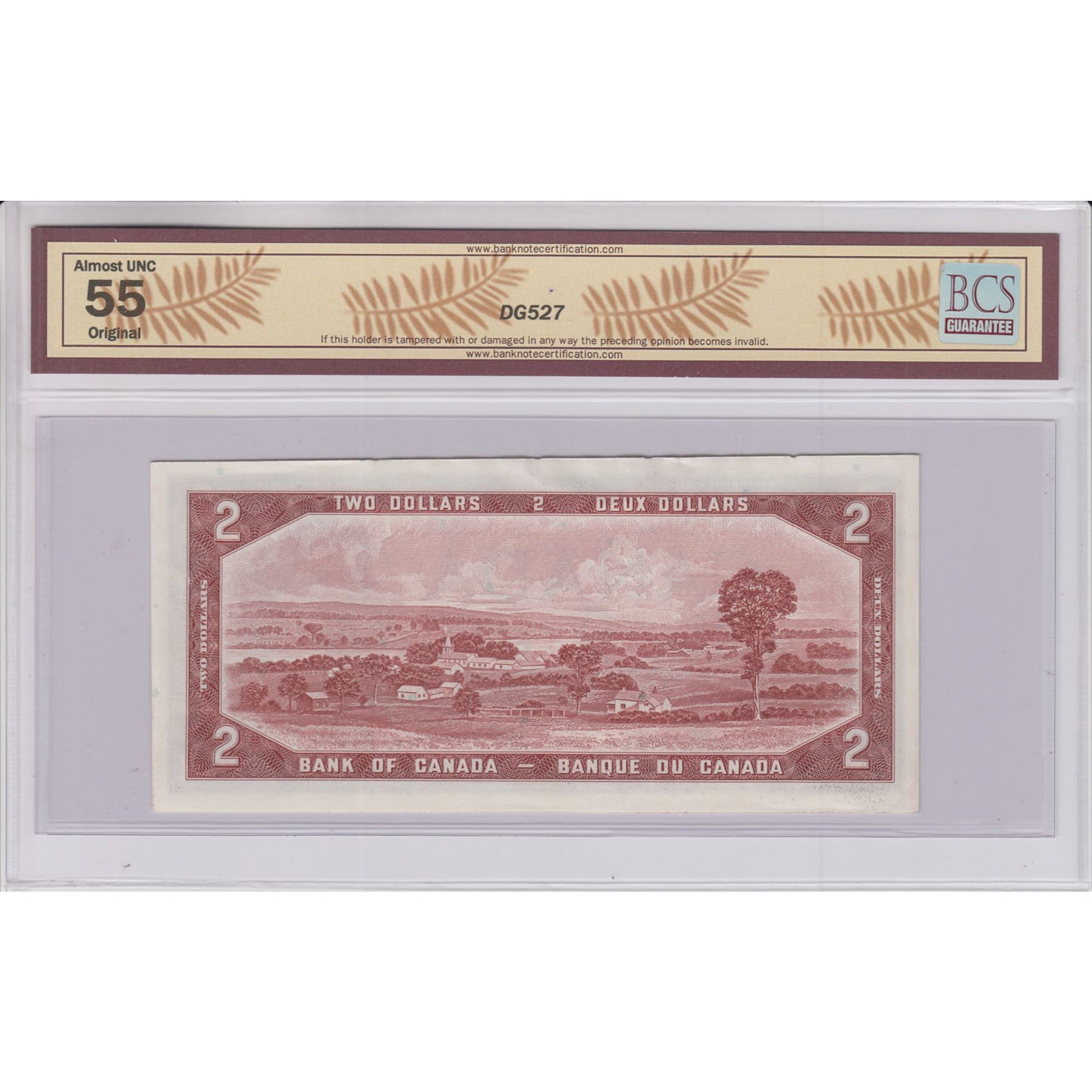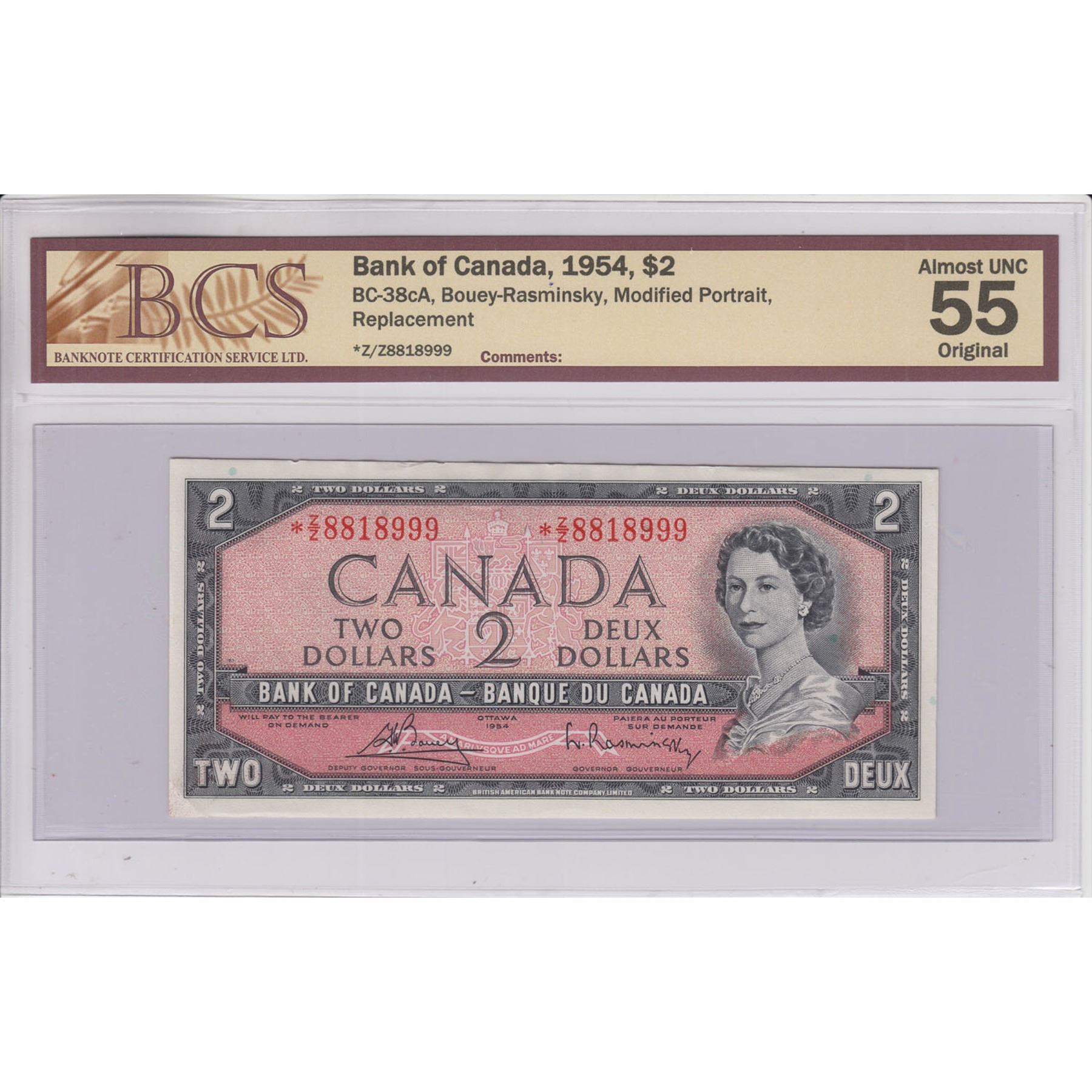 BC-38cA 1954 Bank of Canada Modified Replacement *Z/Z $2, Bouey-Rasminsky S/N: *Z/Z8818999, BCS Certified AU-55 Original! *Extremely RARE Replacement note!* It is estimated that possibly 400 of these were ever printed, very few known examples have hit the market this is the rarest of all the 1954 Replacement $2 Bank Notes. Worth a premium Bid!