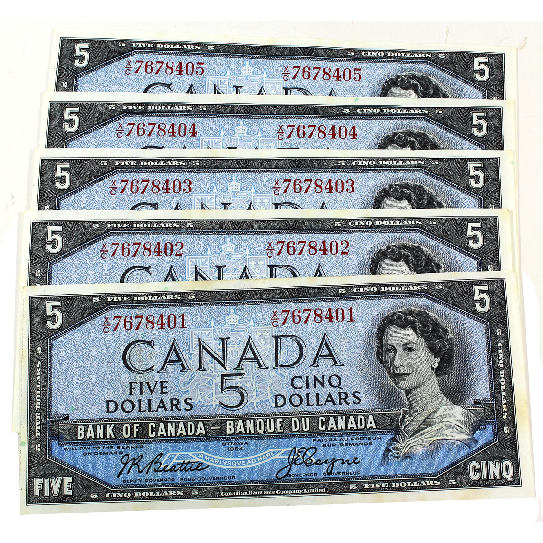 BC-39a-i 1954 $5 Consecutive #   UNC Beattie-Coyne SN: X/C7678401 to  405. 5pcs