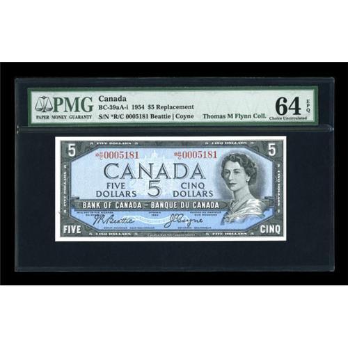 <B>BC-39aA-i $5 1954</B></I><BR> A second 1954 $5 replacement, this bearing the *R/C block letters. PMG graded <B>Choice Uncirculated 64 EPQ.</B></I><BR><I>From The Thomas M. Flynn Collection</B></I><BR><BR><b>Shipping:</b> Coins & Currency (<a target="_blank" href="http://www.heritageauctions.com/common/shipping.php">view shipping information</a>)