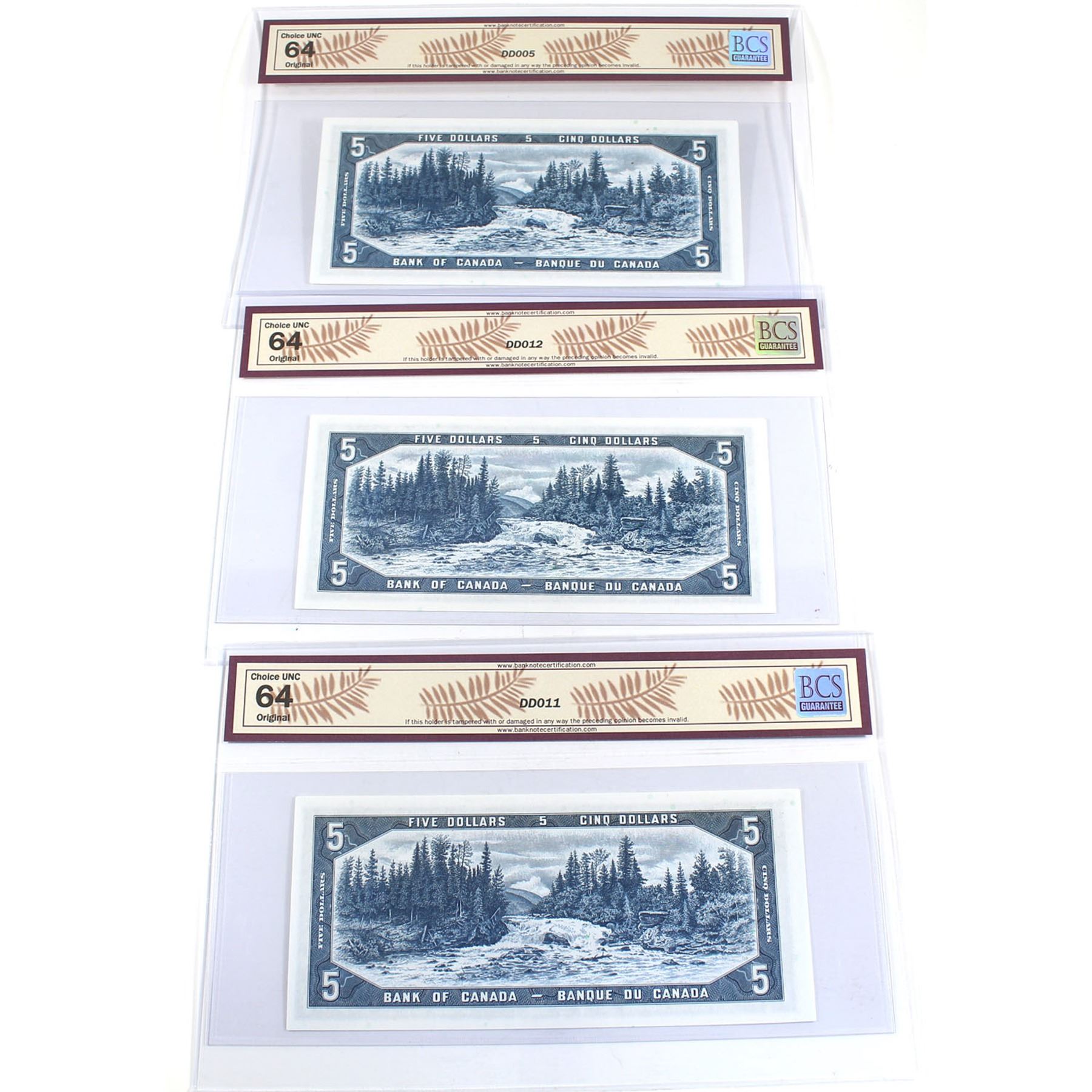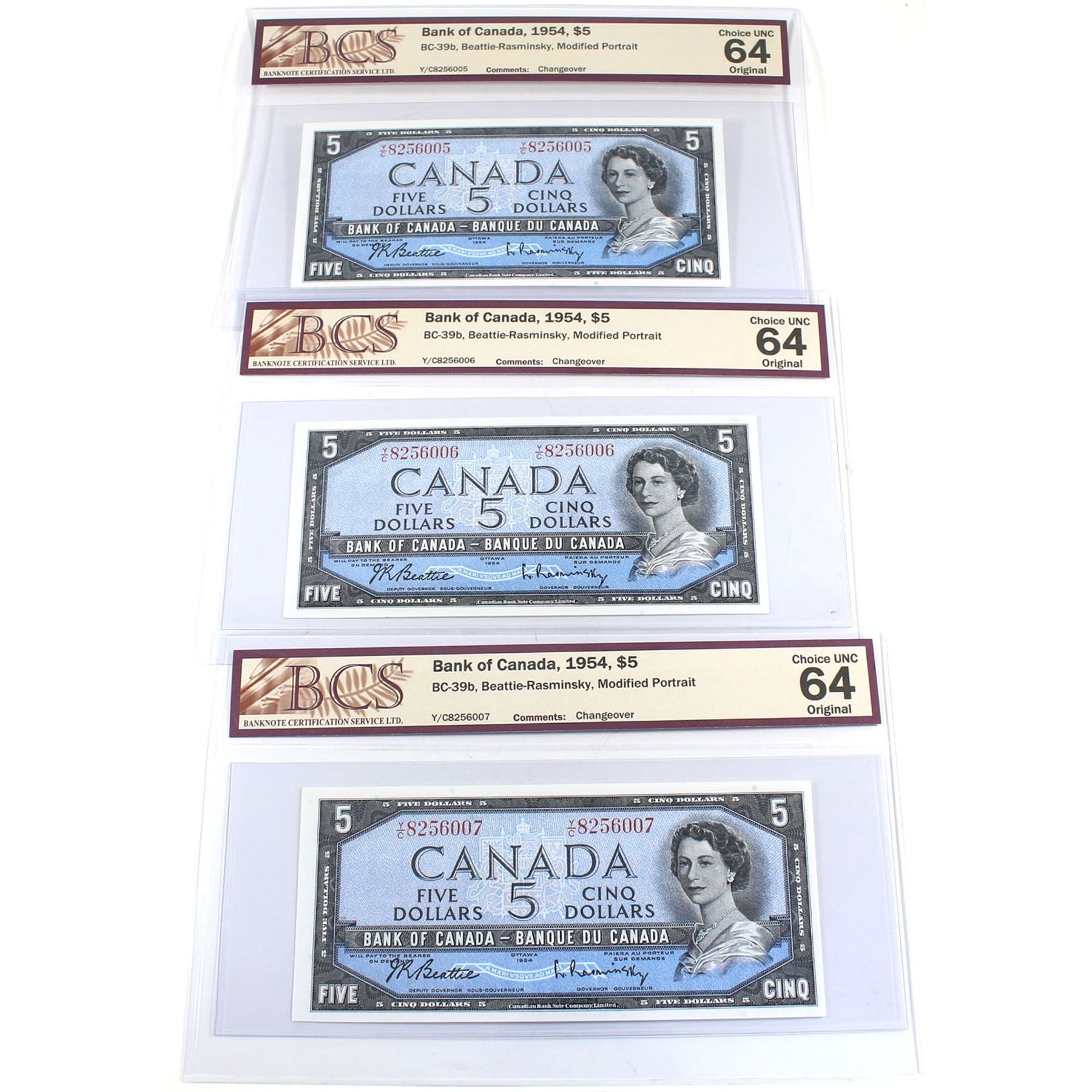 BC-39b 3 Sequential 1954 Bank of Canada Modified $5 Beattie-Rasminsky, S/N: Y/C8256005/006/007. All 3 notes BCS Certified Choice UNC-64 Original! 3pcs