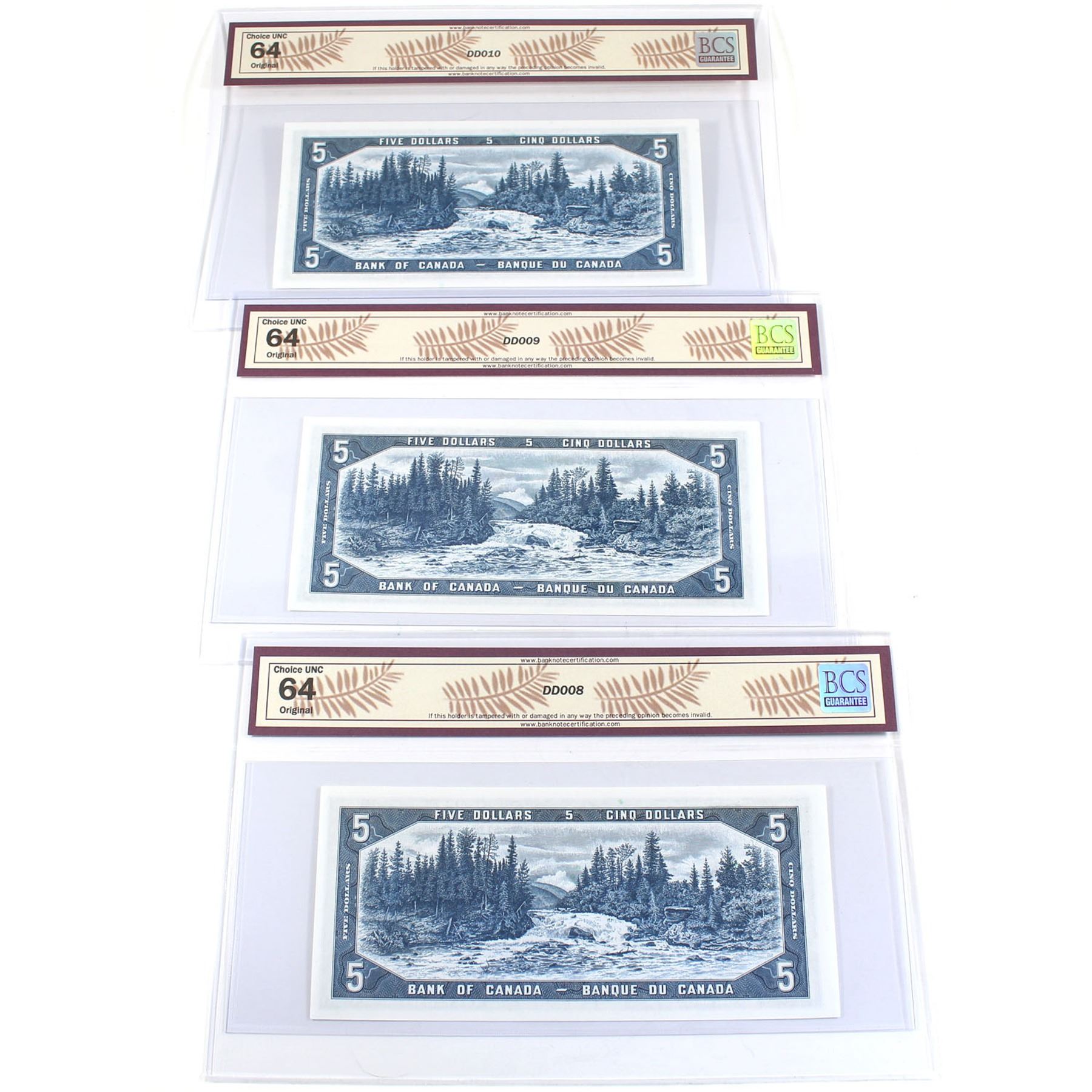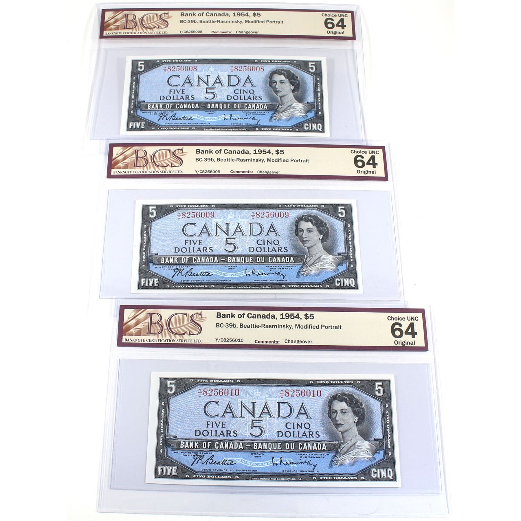BC-39b 3 Sequential 1954 Bank of Canada Modified $5 Beattie-Rasminsky, S/N: Y/C8256008/009/010. All 3 notes BCS Certified Choice UNC-64 Original! 3pcs