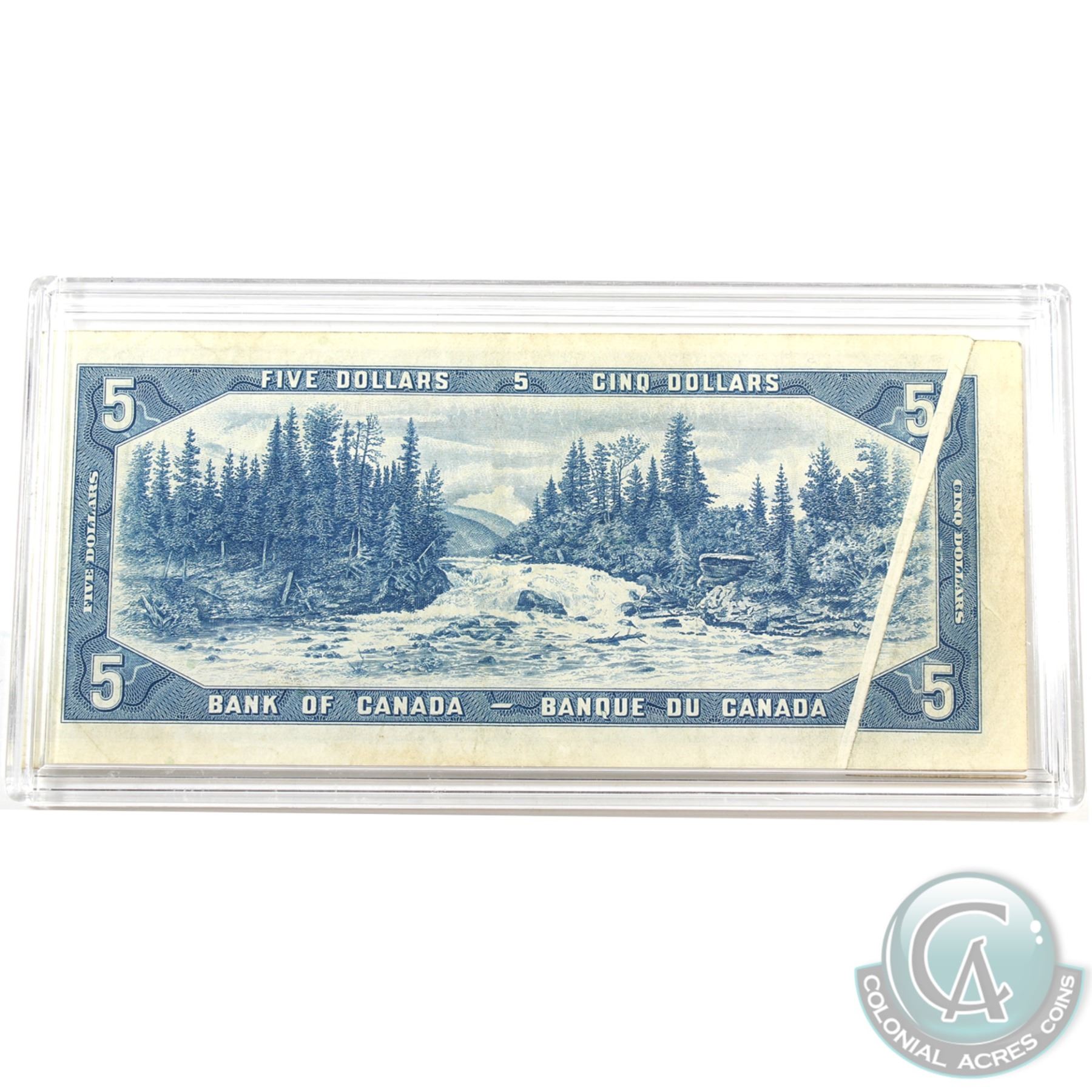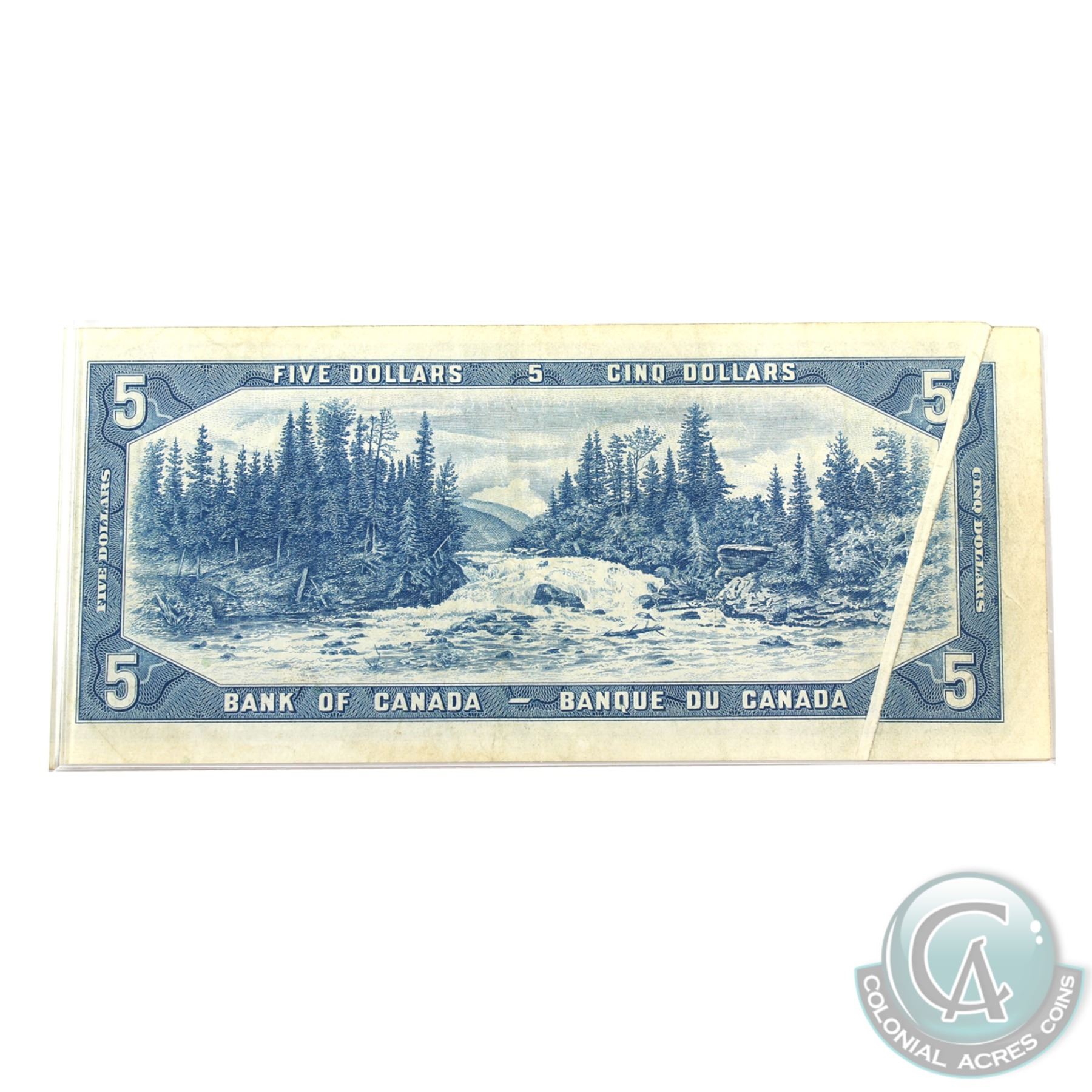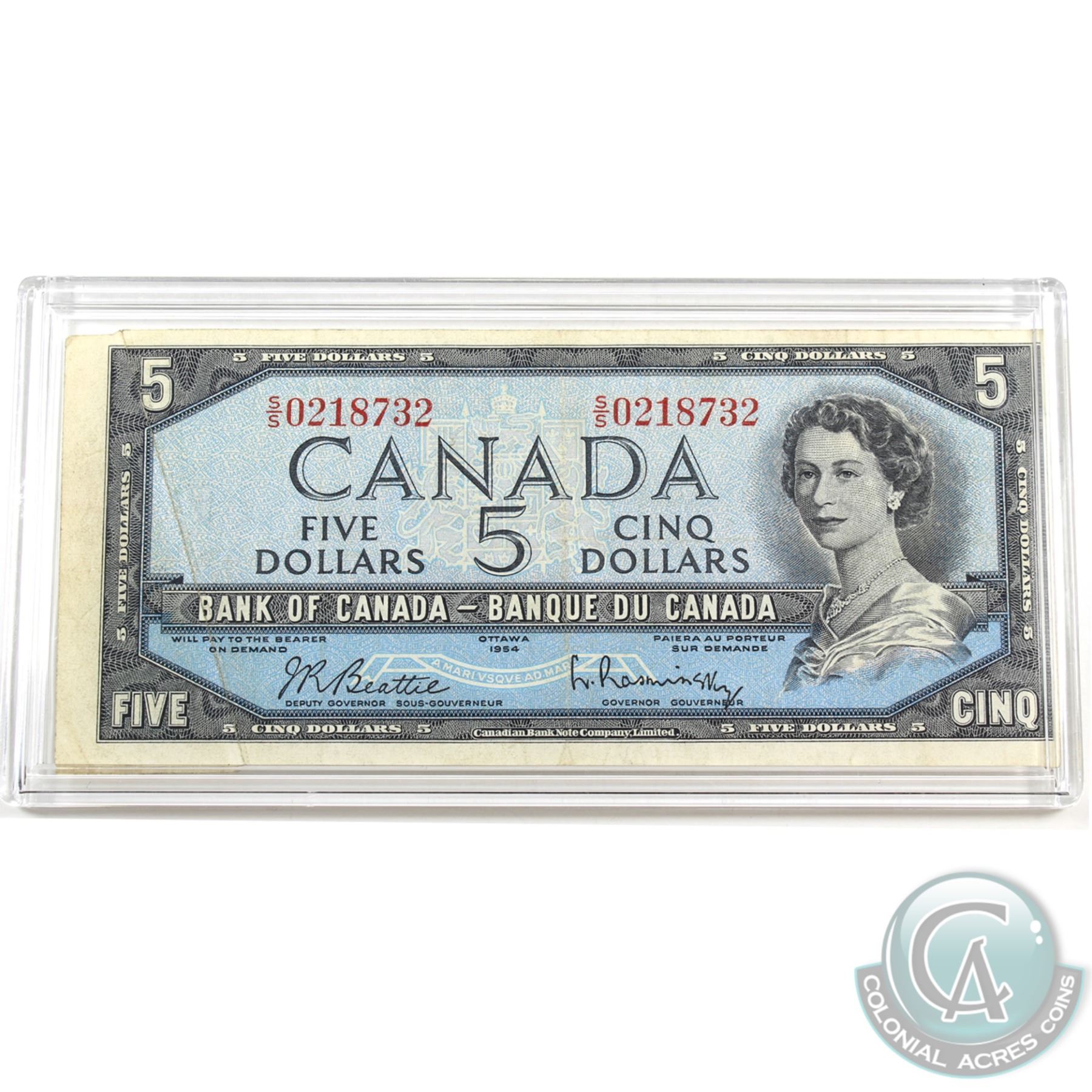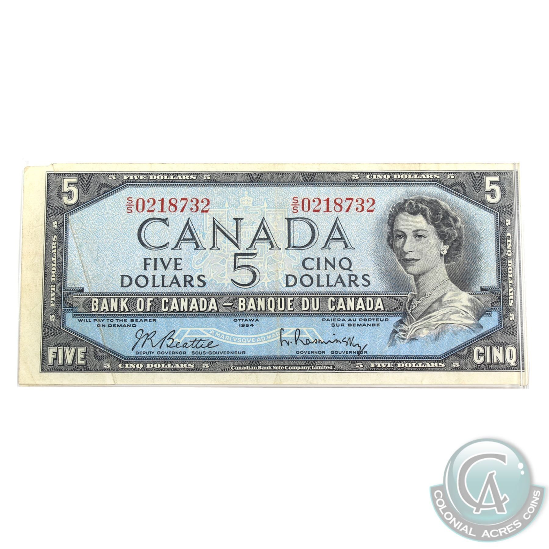 BC-39b-E23-i 1954 Bank of Canada $5 "Gutter Fold" pre-print crease. Beattie-Rasminsky S/N: S/S0218732 Very Fine. A visually appealing error.