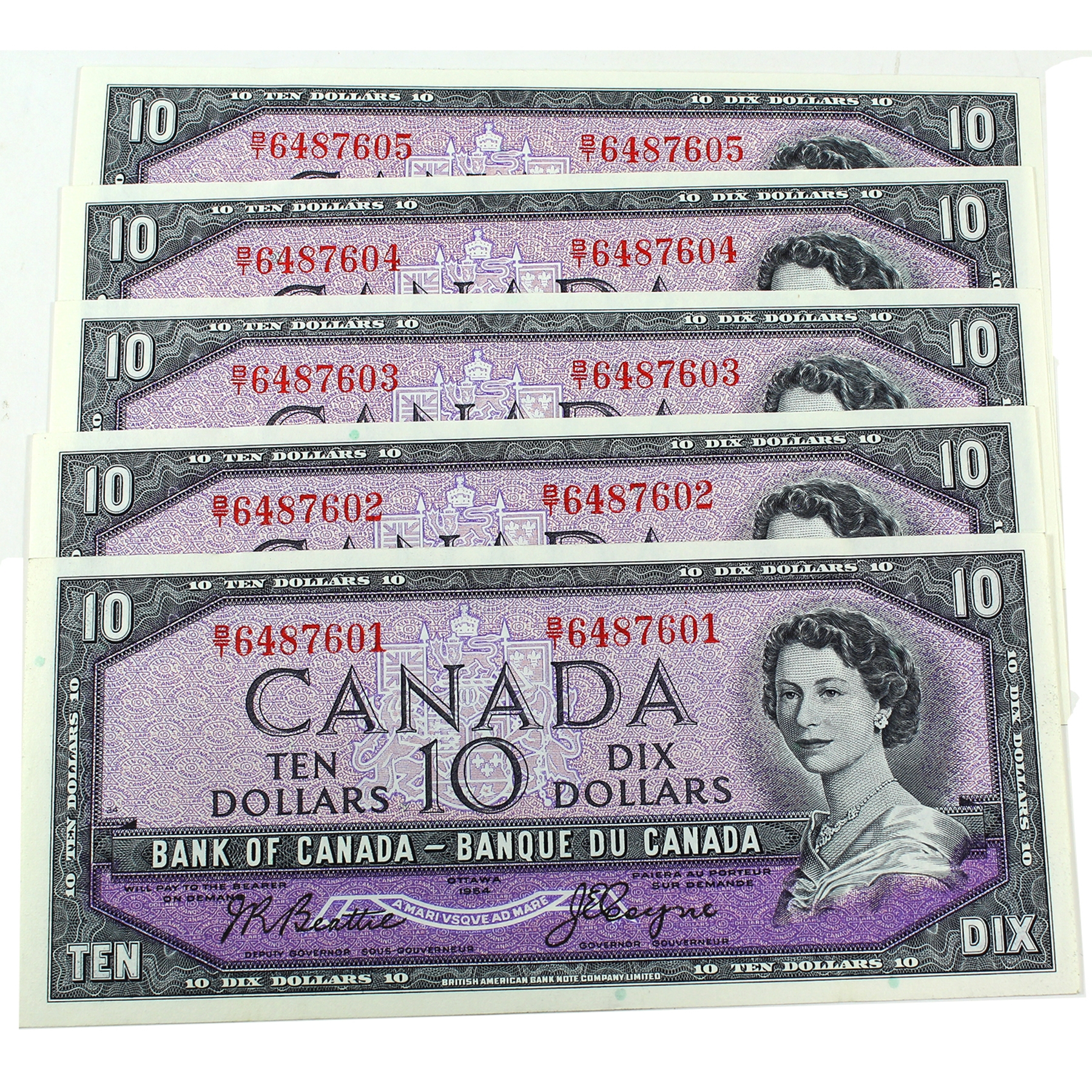 BC-40a 1954 $10 Consecutive #   UNC Beattie-Coyne SN: B/T6487601 to  605. 5pcs