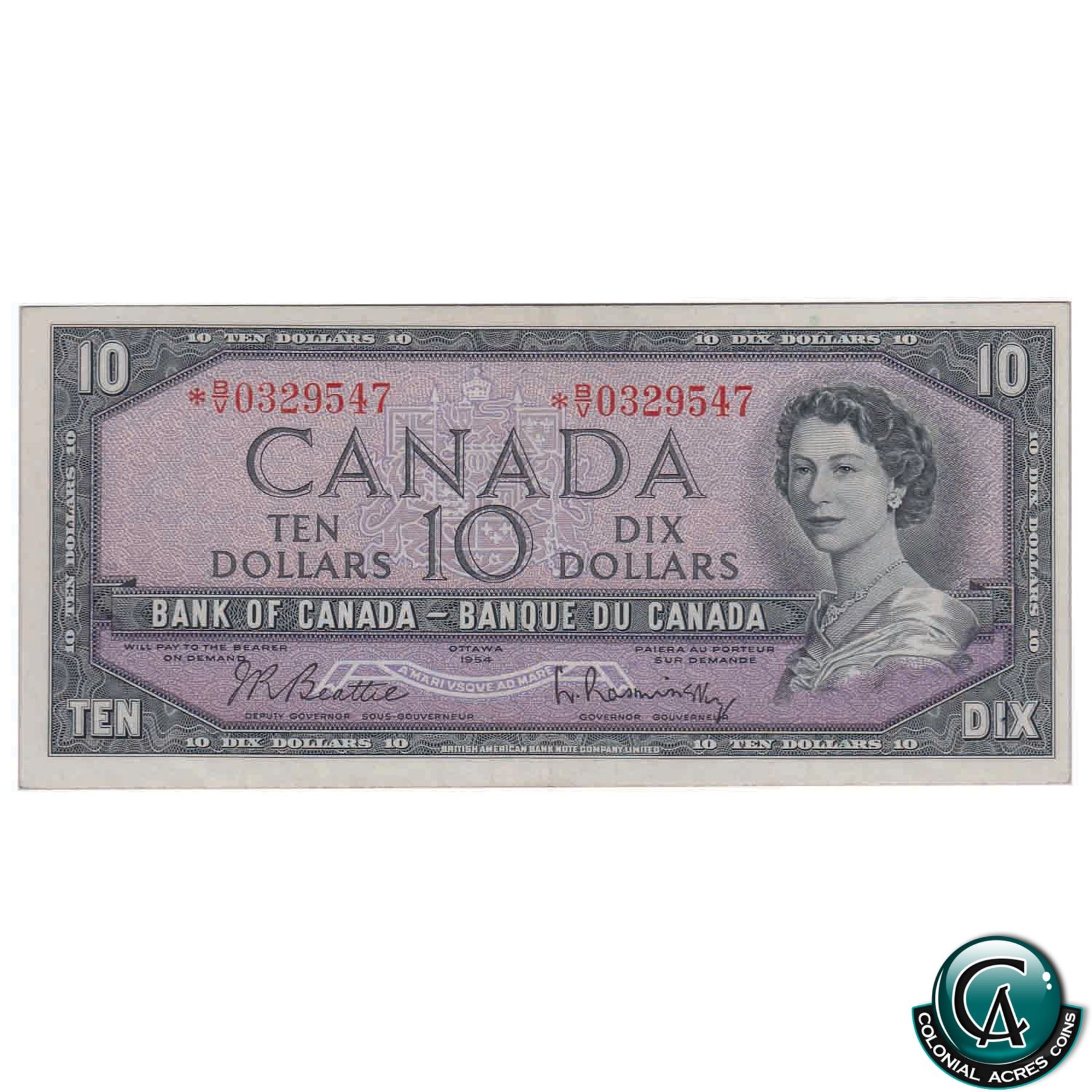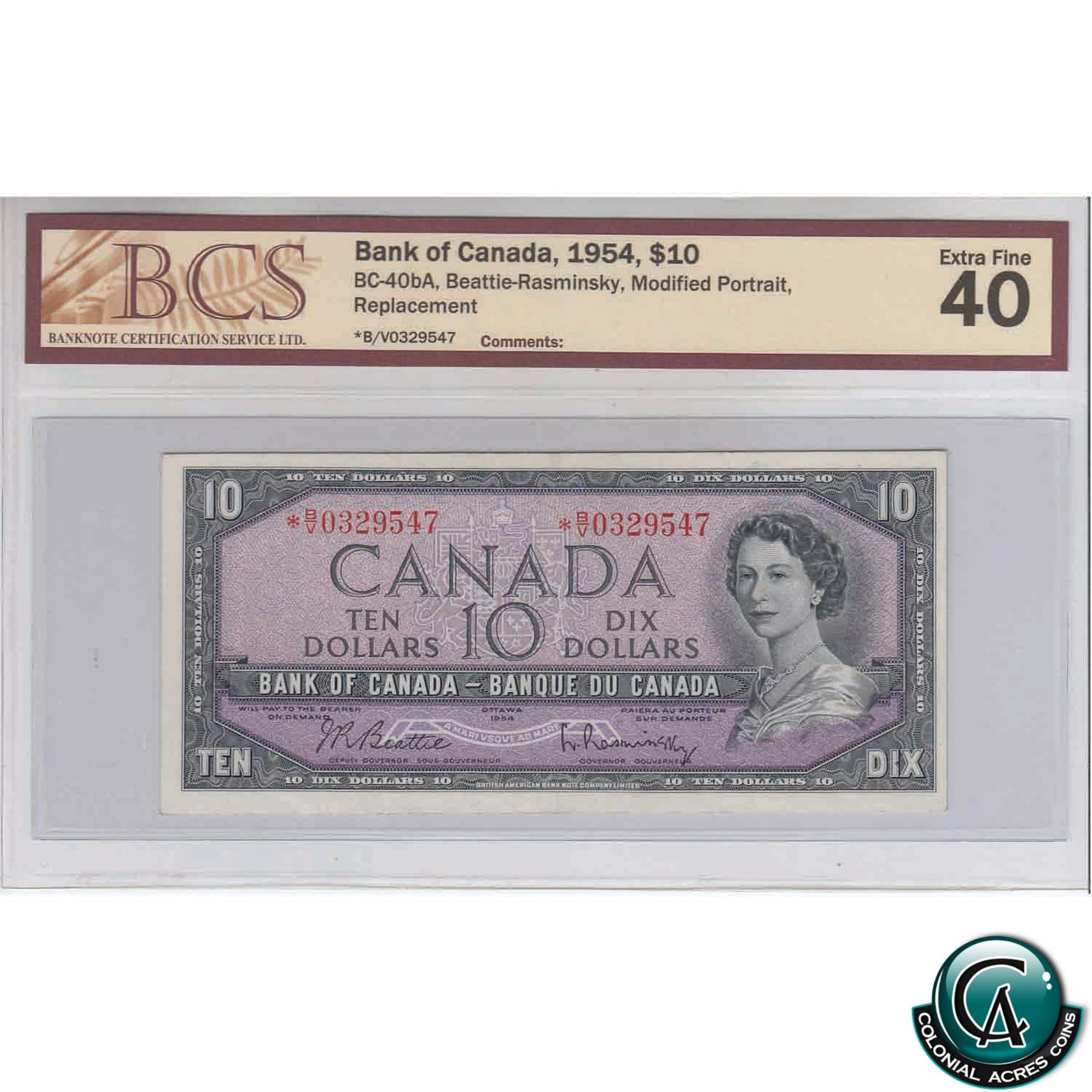 BC-40bA 1954 Bank of Canada $10, Beattie-Rasminsky, Modified Portrait, Replacement, *BV 0329547, BCS EF-40
