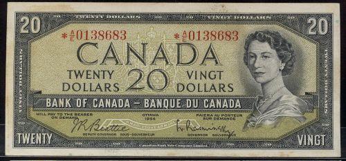 BC-41bA 1954 $20 Beattie-Rasminski *A/E0138683 Uncirculated, light yellow stains.