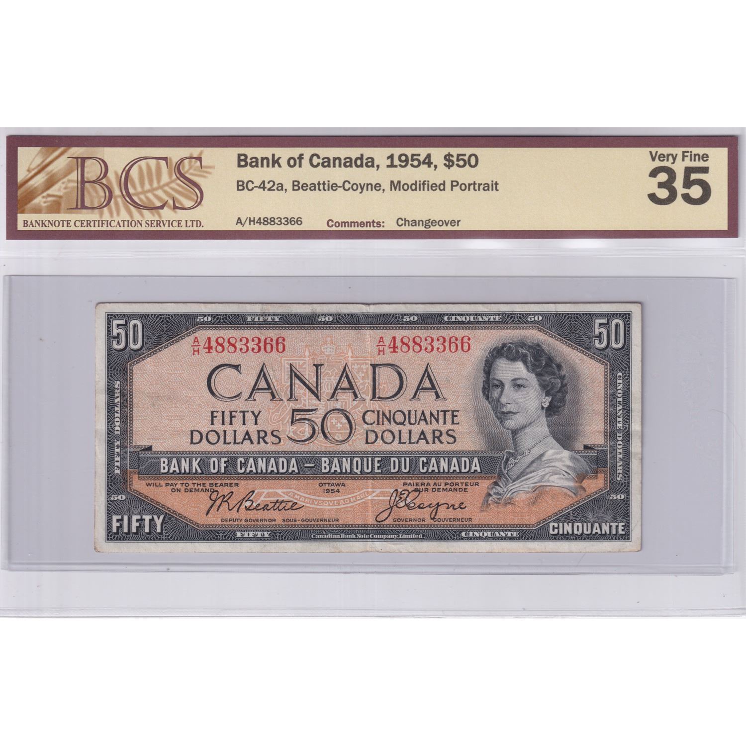 BC-42a 1954 Canada $50, Beattie-Coyne, Modified Portrait, Changeover, SN:A/H4883366, BCS Certified VF-35