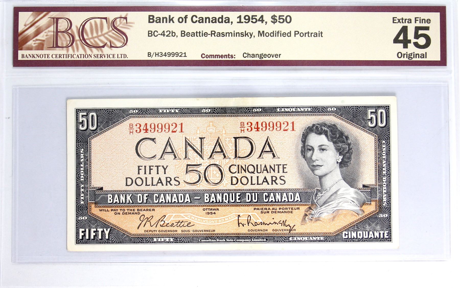 BC-42b, 1954 Bank of Canada $50, Beattie-Rasminsky, Modified Portrait BCS Certified EF-45 Original