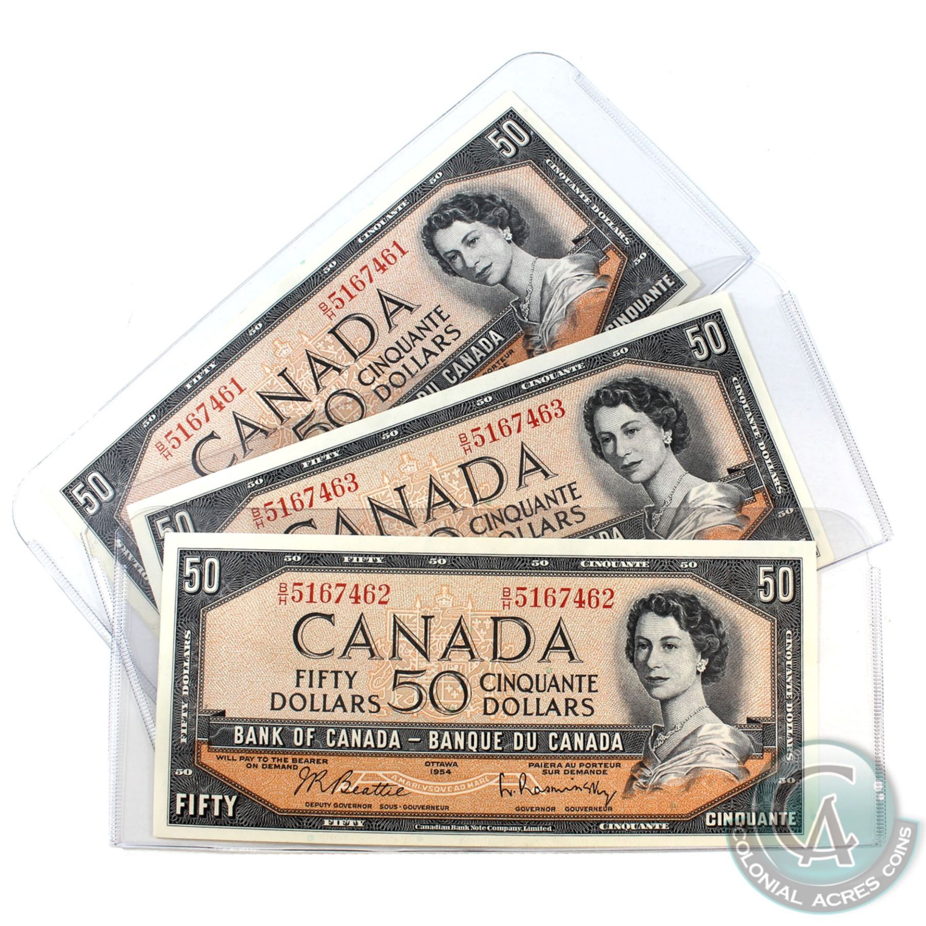 BC-42b, 3 Consecutive 1954 Bank of Canada Modified $50, Beattie-Rasminsky, S/N: B/H5167461/462/463. All notes AU or better condition. 3pcs