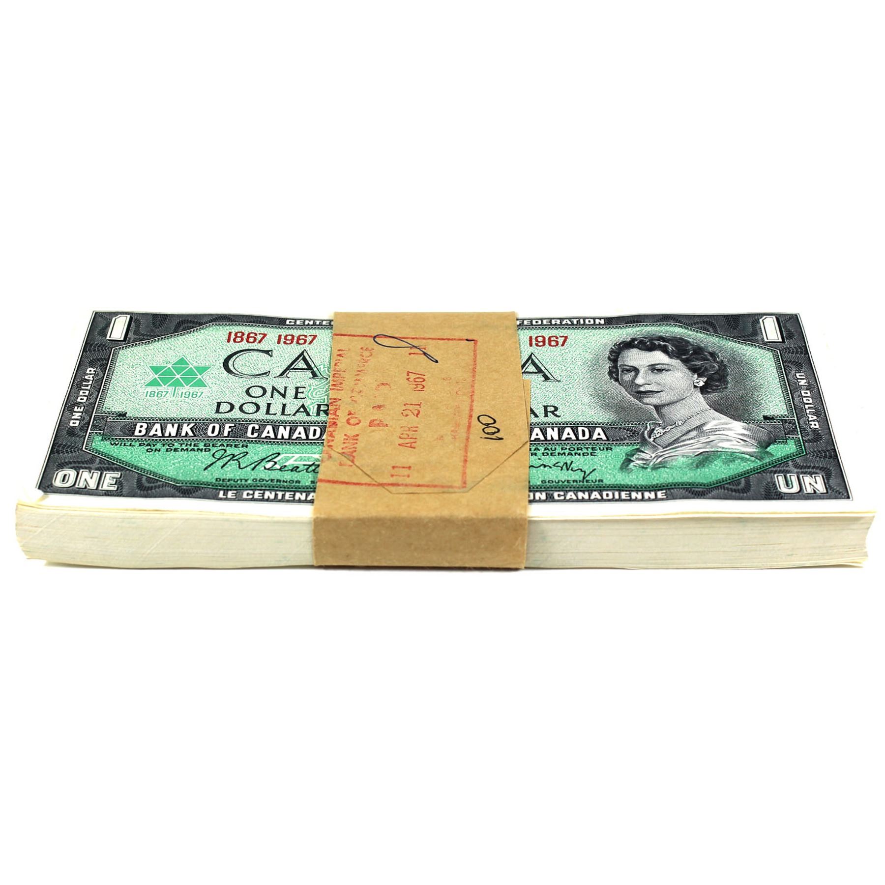 BC-45a 1867-1967 Bank of Canada $1, Bank Bundle of 100 notes with original CIBC stamp dated April, 21st 1967.