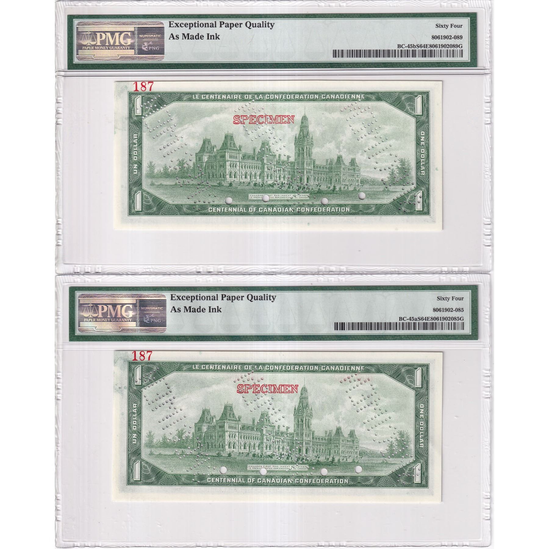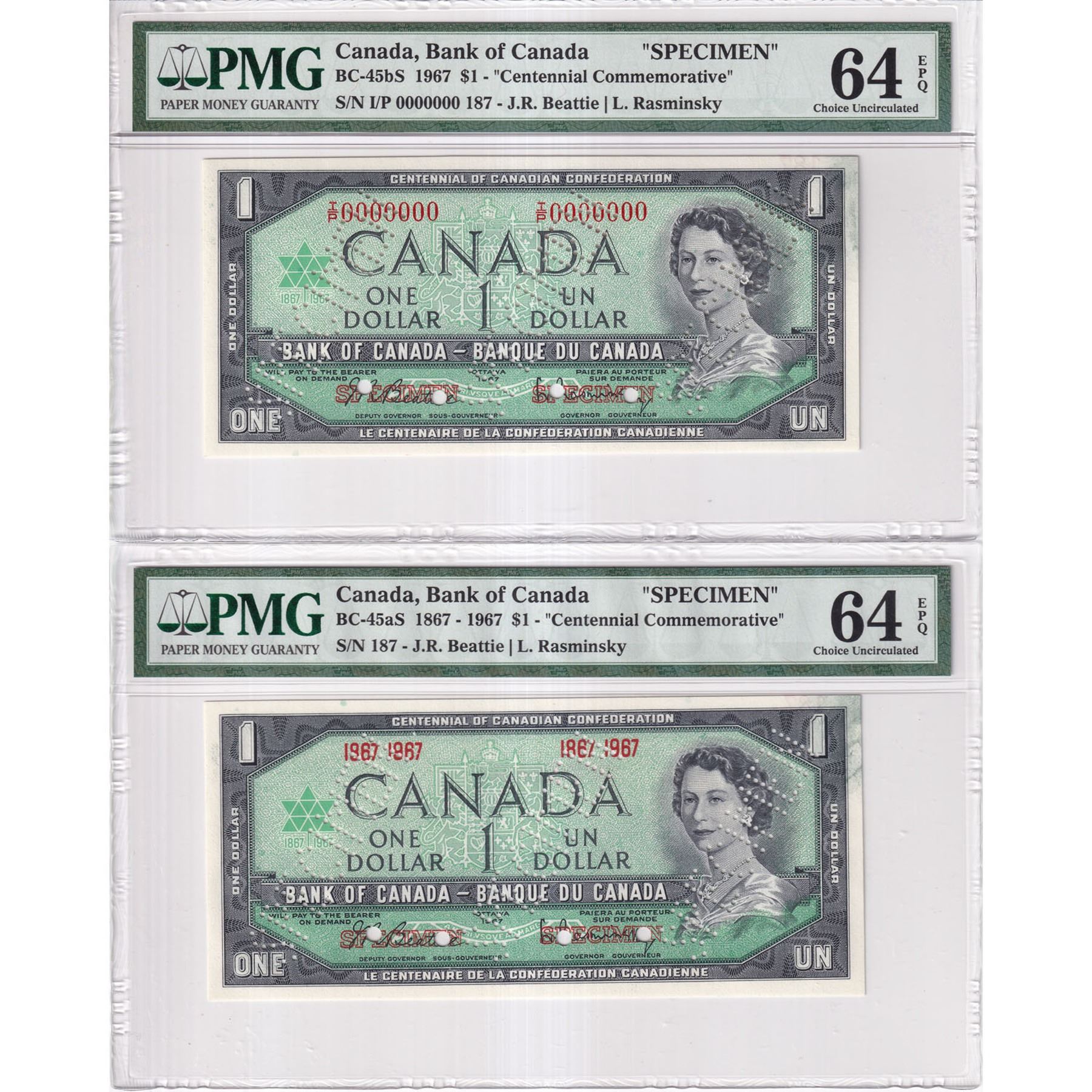 A Matching Set of 2x $1 1967 Specimen Bank notes (#188), Set includes the BC-45aS Double Dates 1867-1967 issue, and the BC-45bS, I/P Prefix, Both notes are Beattie-Rasminsky Signatures and PMG Certified CUNC-64 EPQ!
