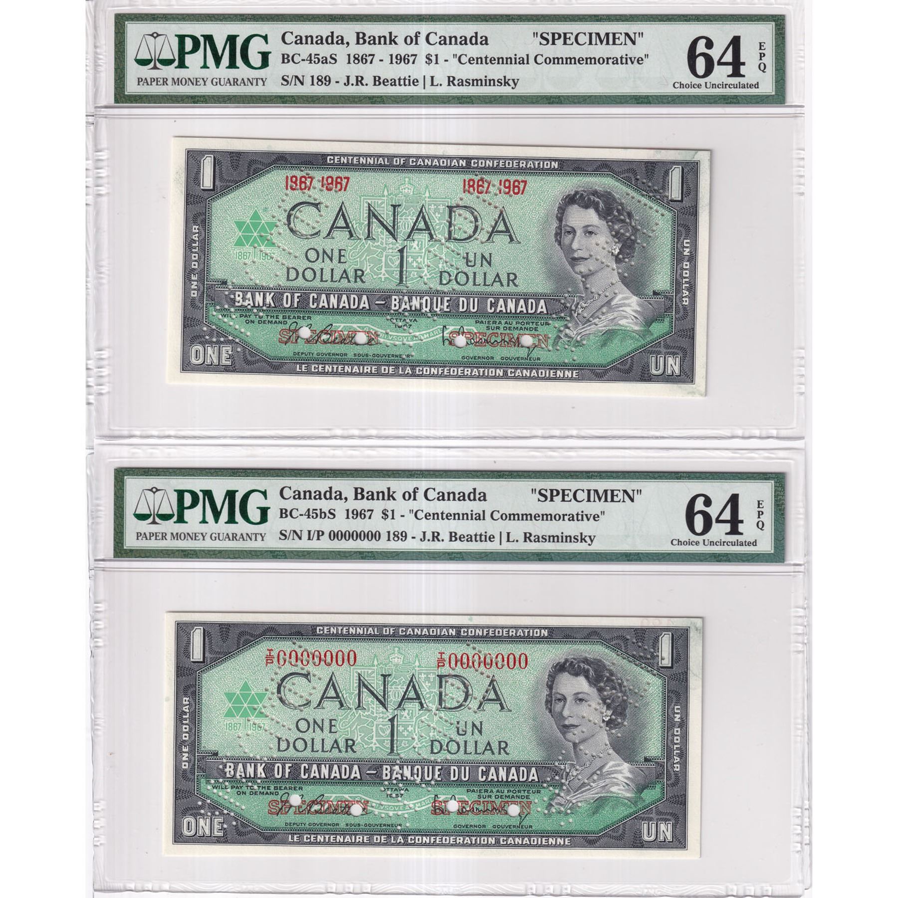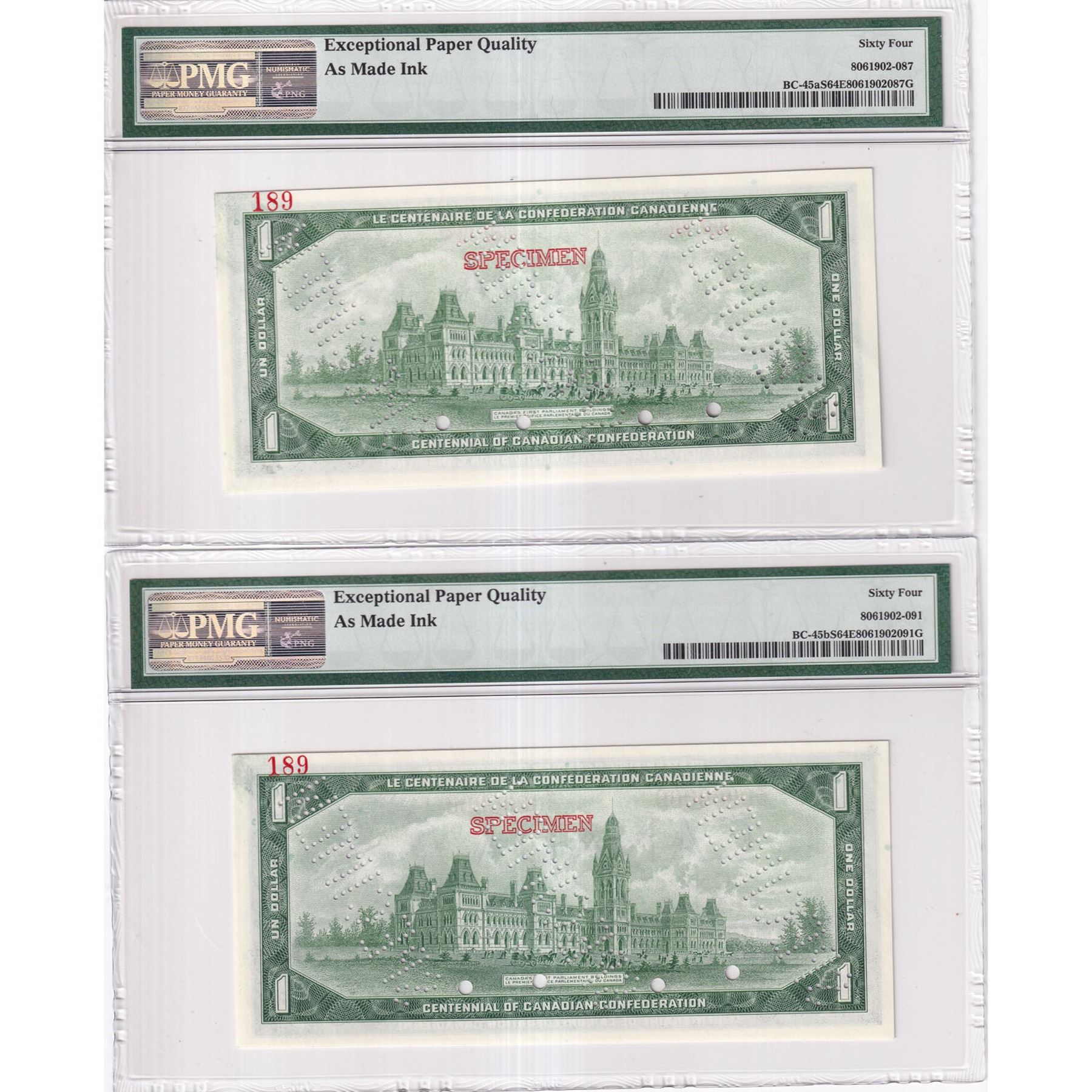 A Matching Set of 2x $1 1967 Specimen Bank notes (#189), Set includes the BC-45aS Double Dates 1867-1967 issue, and the BC-45bS, I/P Prefix, Both notes are Beattie-Rasminsky Signatures and PMG Certified CUNC-64 EPQ!