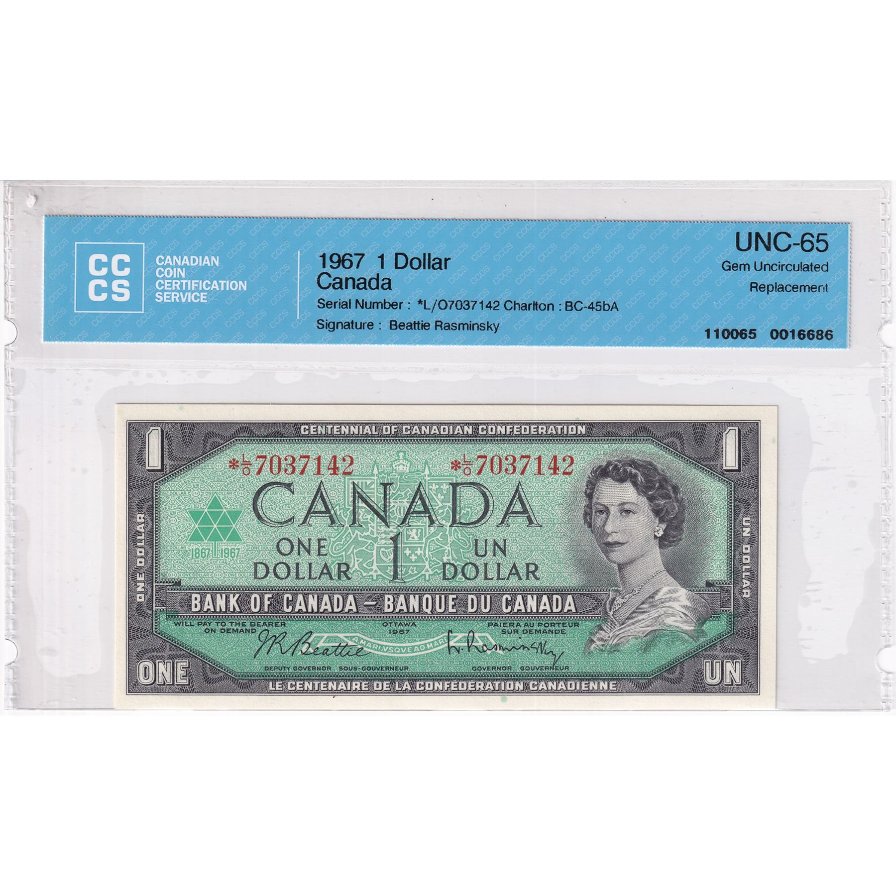 BC-45bA 1967 Bank of Canada Replacement $1, Beattie-Rasminsky S/N: *L/O7037142. CCCS Certified GEM UNC-65