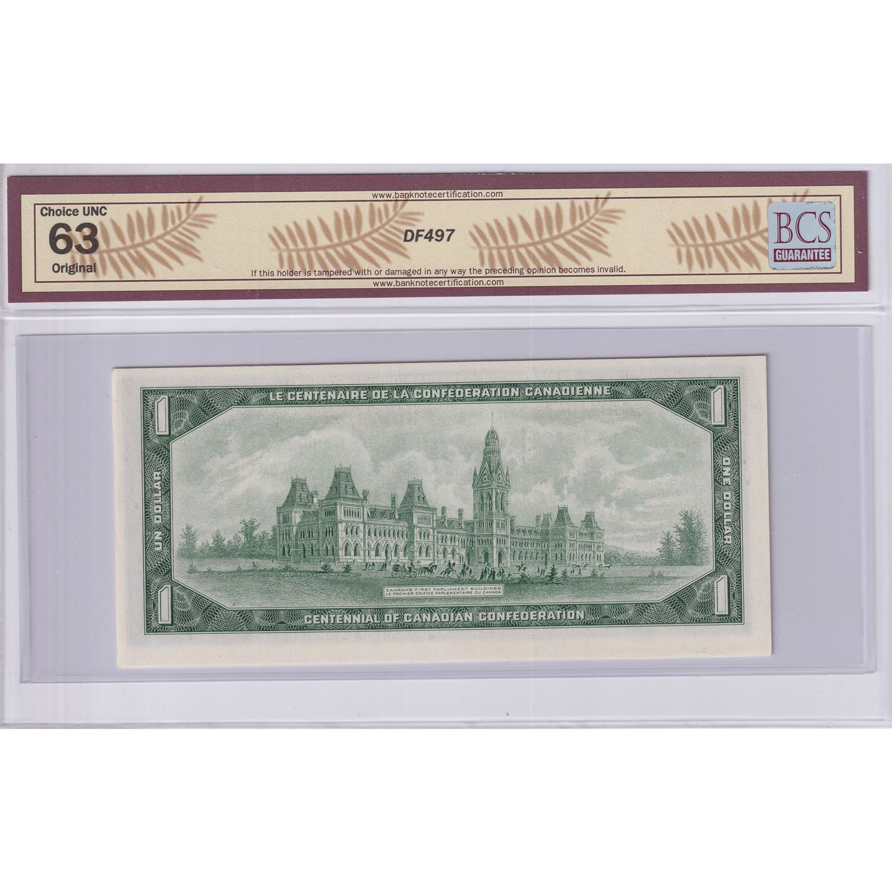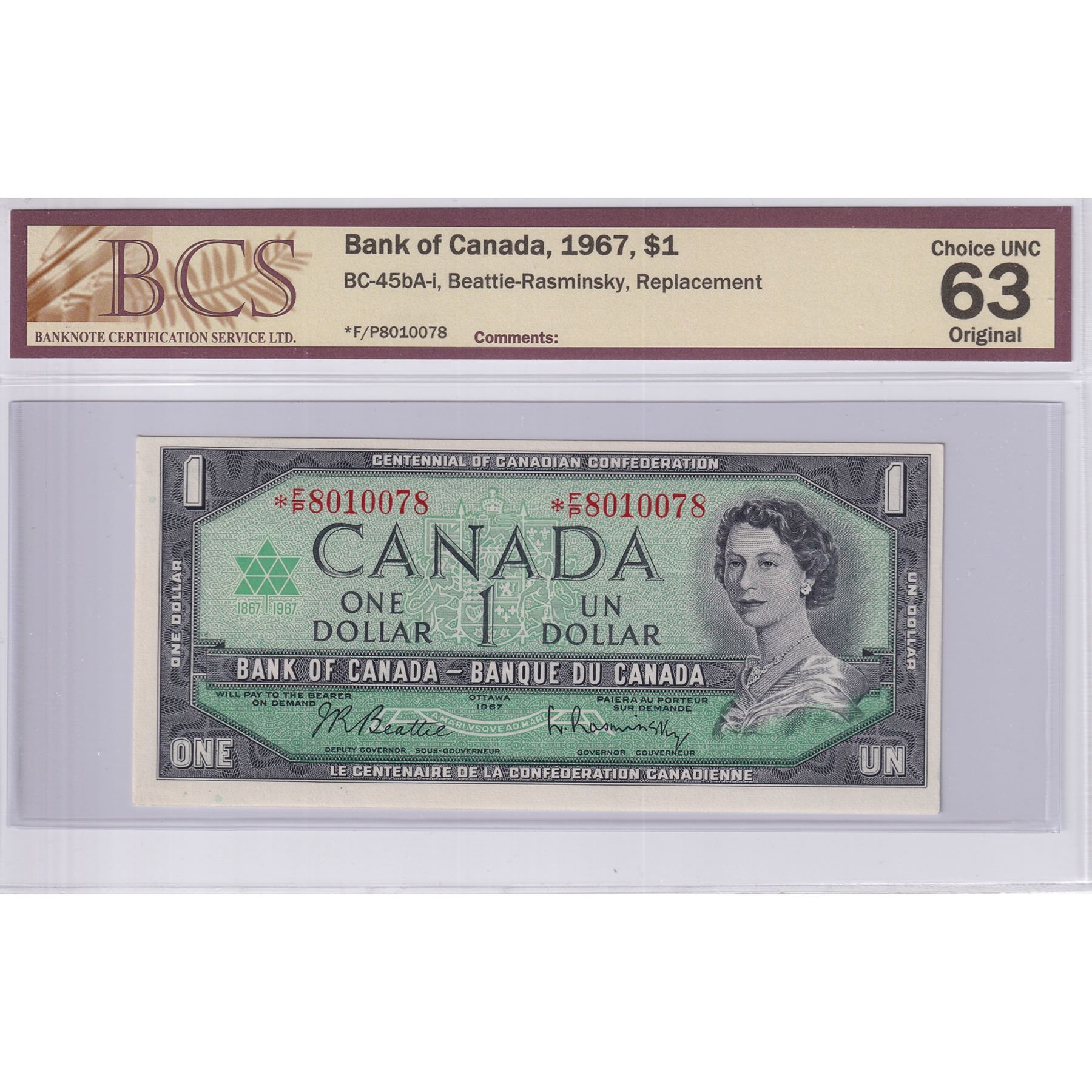 BC-45bA-I 1967 Bank of Canada Replacement $1, Beattie-Rasminsky S/N: *F/P8010078, BCS Certified CUNC-63 Original.