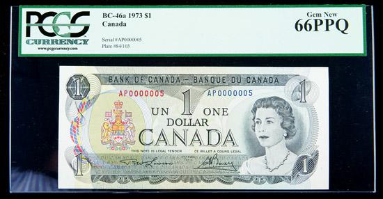 BC-46a 1973 $1. PCGS Gem New 66PPQ. Serial number AP0000005.