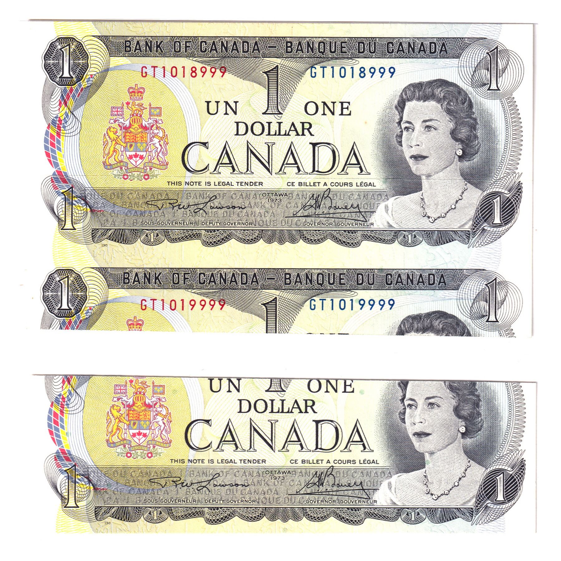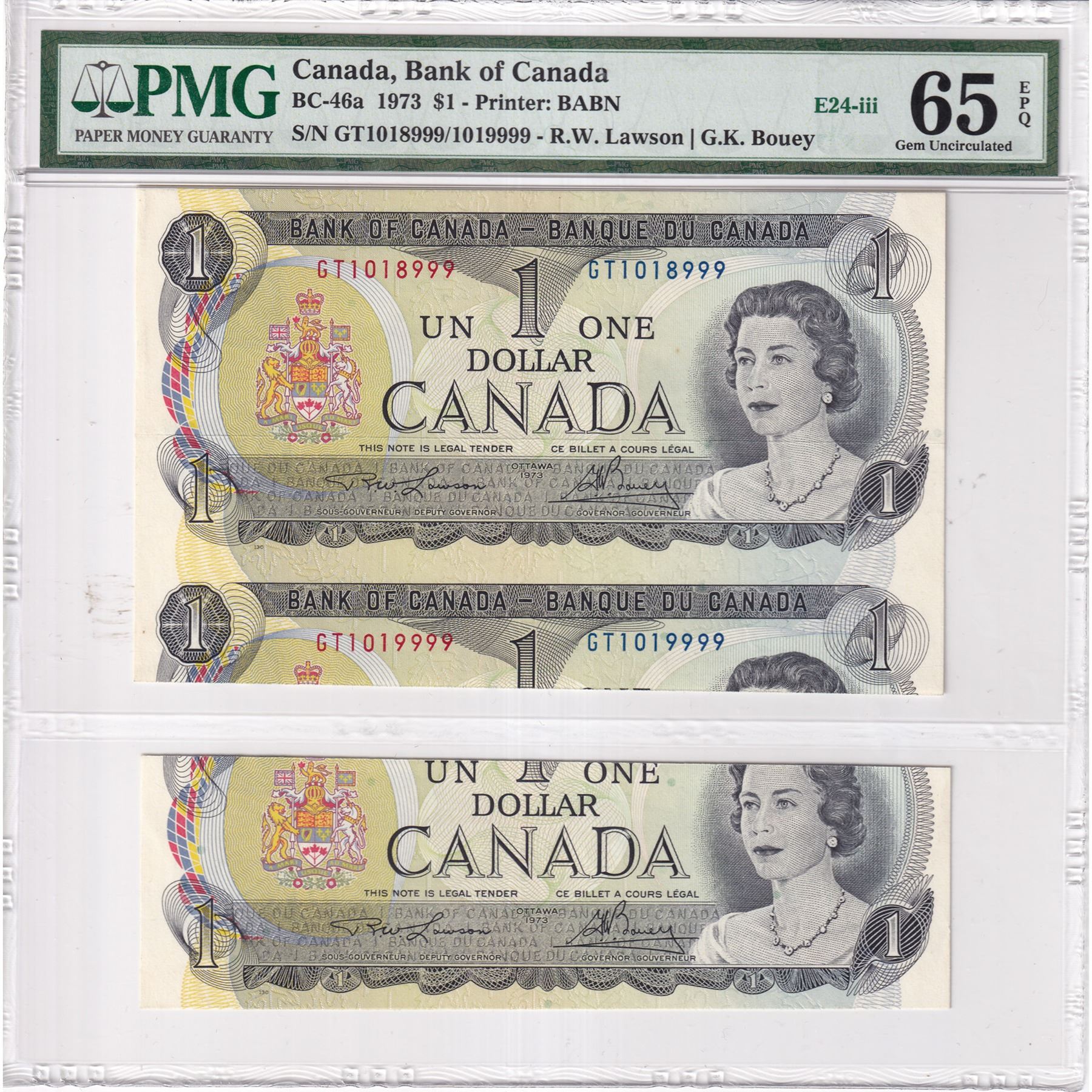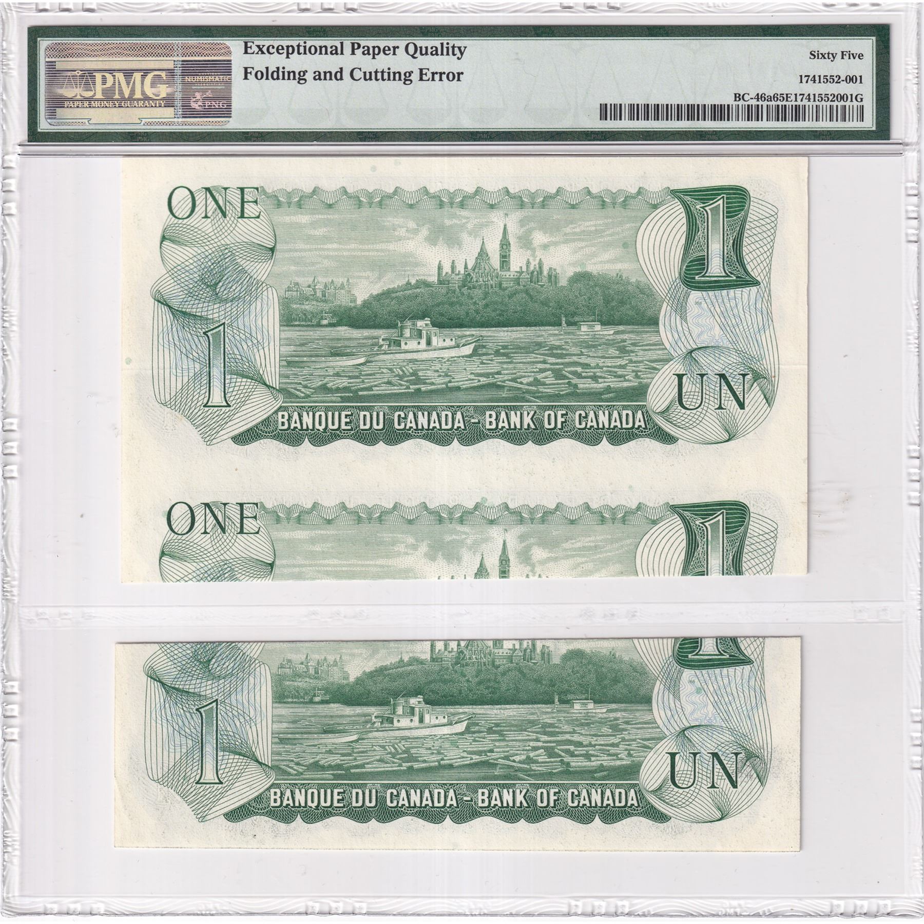 BC-46a 1973 Bank of Canada $1, Lawson-Bouey Folding and Cutting Error E24-iii, PMG Certified GUNC-65 EPQ, S/N: GT1018999/1019999. The top note contains approximately one third of the lower note in the original uncut sheet. Spectacular error that was found in an original bundle.