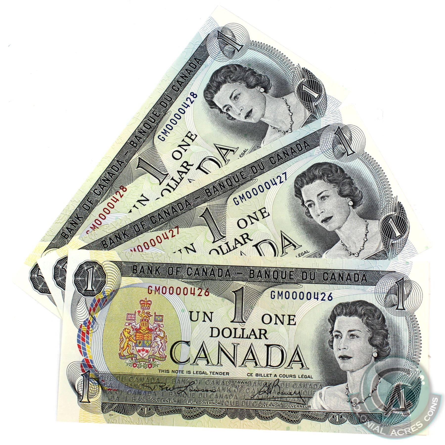 BC-46a-N5-iv 1973 Bank of Canada $1 Lawson-Bouey Low Serial Number Consecutive GM0000426-28 UNC+. 3pcs