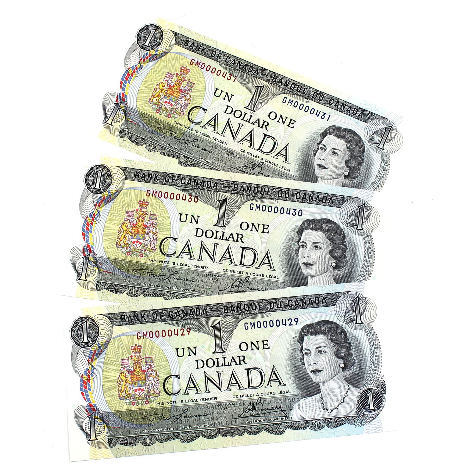 BC-46a-N5-iv 1973 Bank of Canada $1 Lawson-Bouey Low Serial Number Consecutive GM0000429-31 UNC+.3pcs