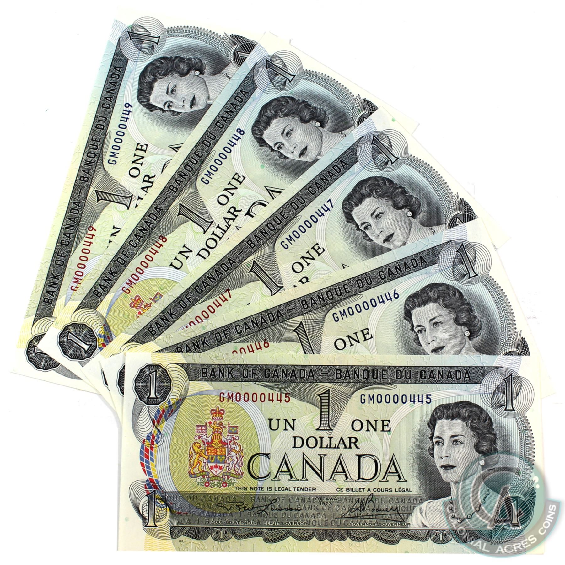 BC-46a-N5-iv 1973 Bank of Canada $1 Lawson-Bouey Low Serial Number Consecutive GM0000445-49 UNC+. 5pcs