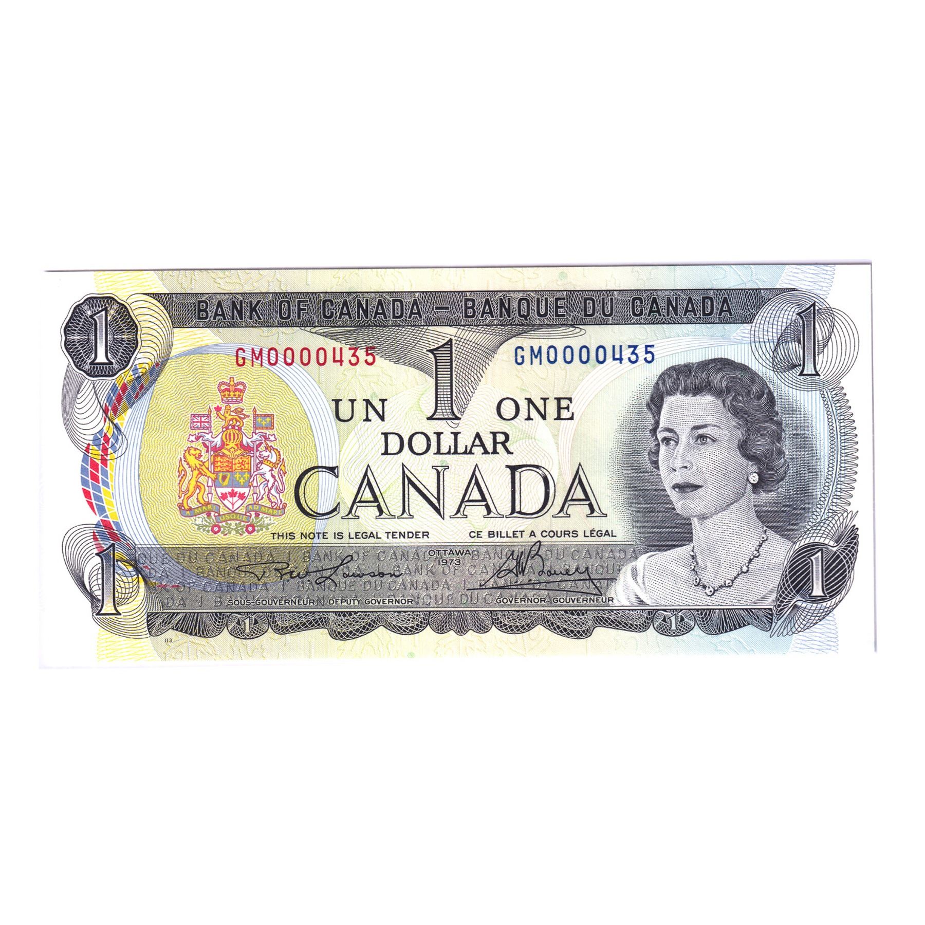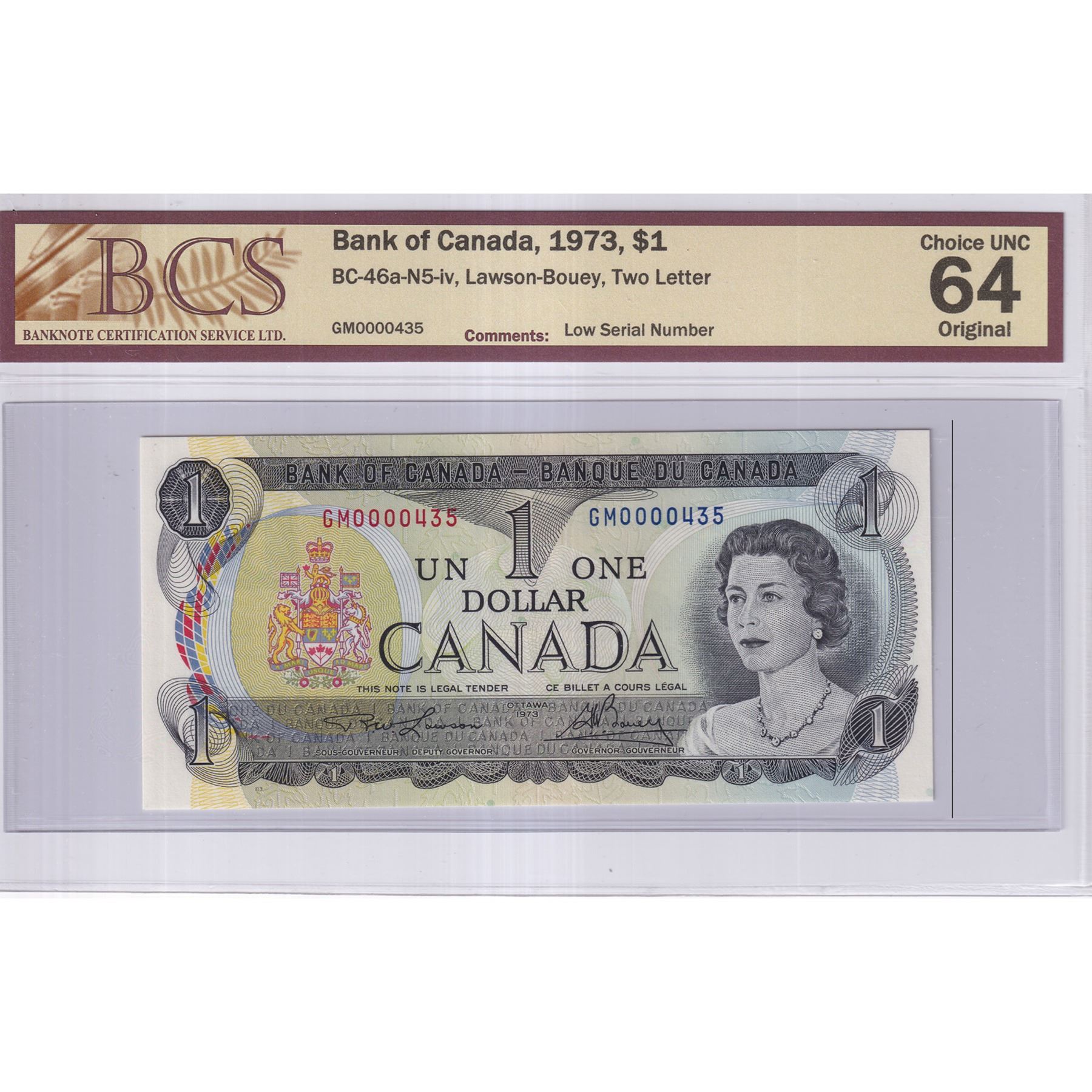 BC-46a-N5-iv 1973 Bank of Canada $1, Lawson-Bouey, Low Serial Number GM0000435, BCS Certified CUNC-64 Original
