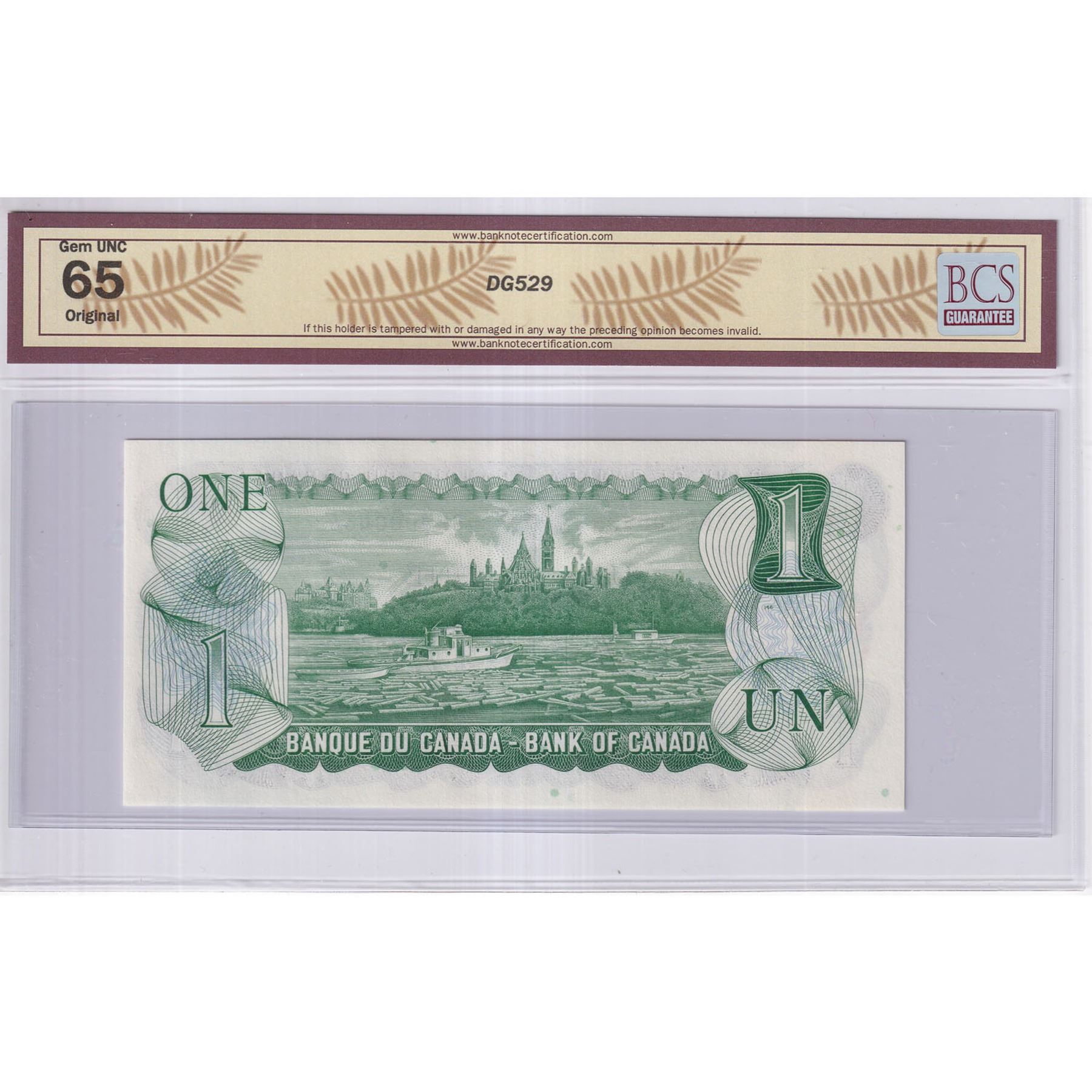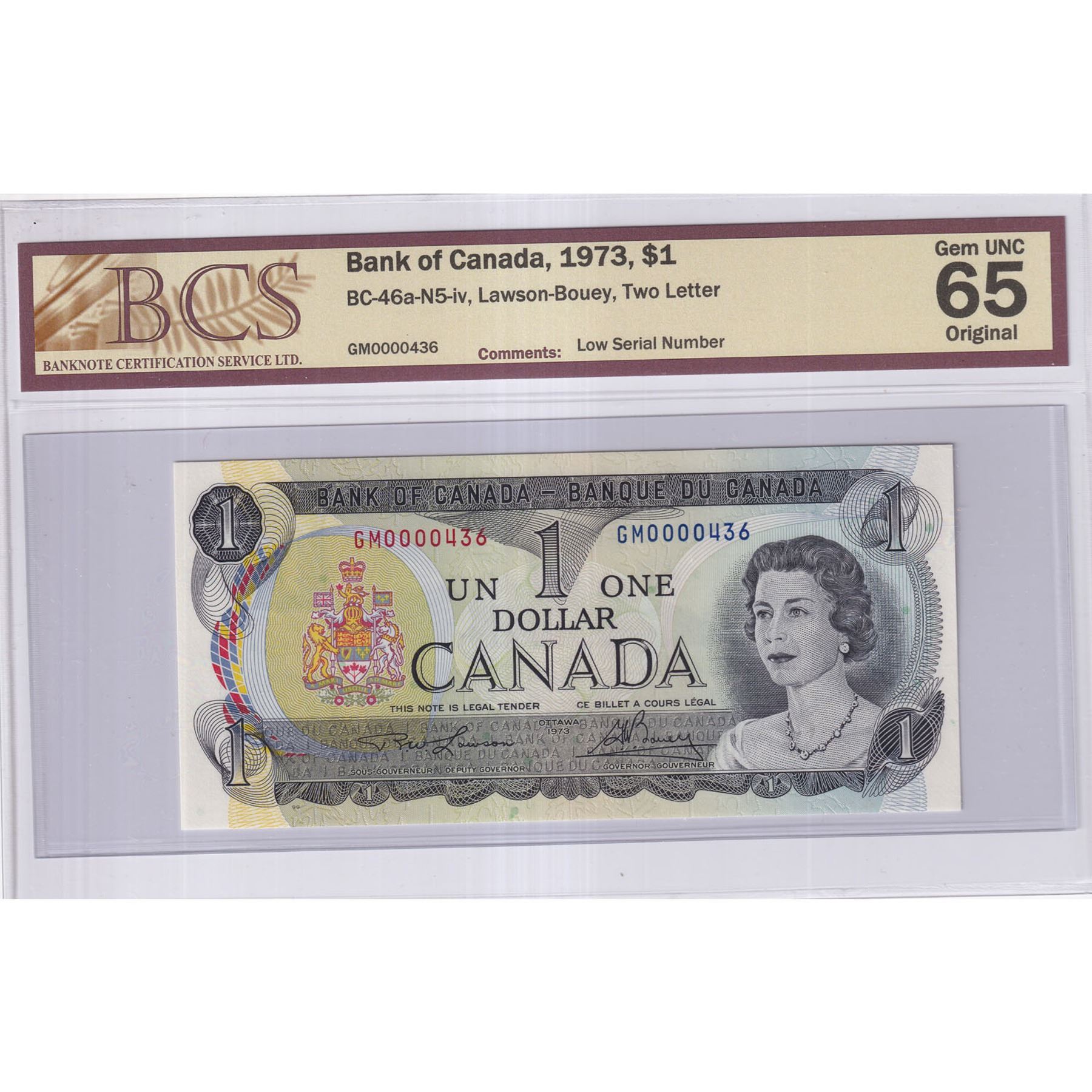 BC-46a-N5-iv 1973 Bank of Canada $1, Lawson-Bouey, Low Serial Number GM0000436, BCS Certified GUNC-65 Original