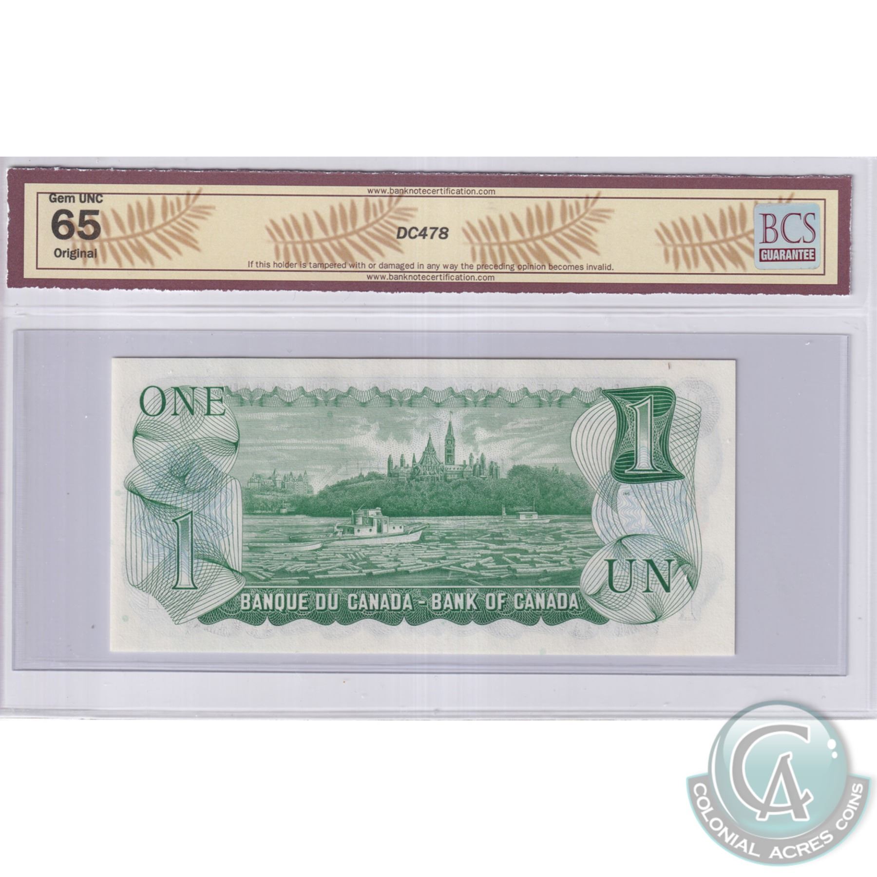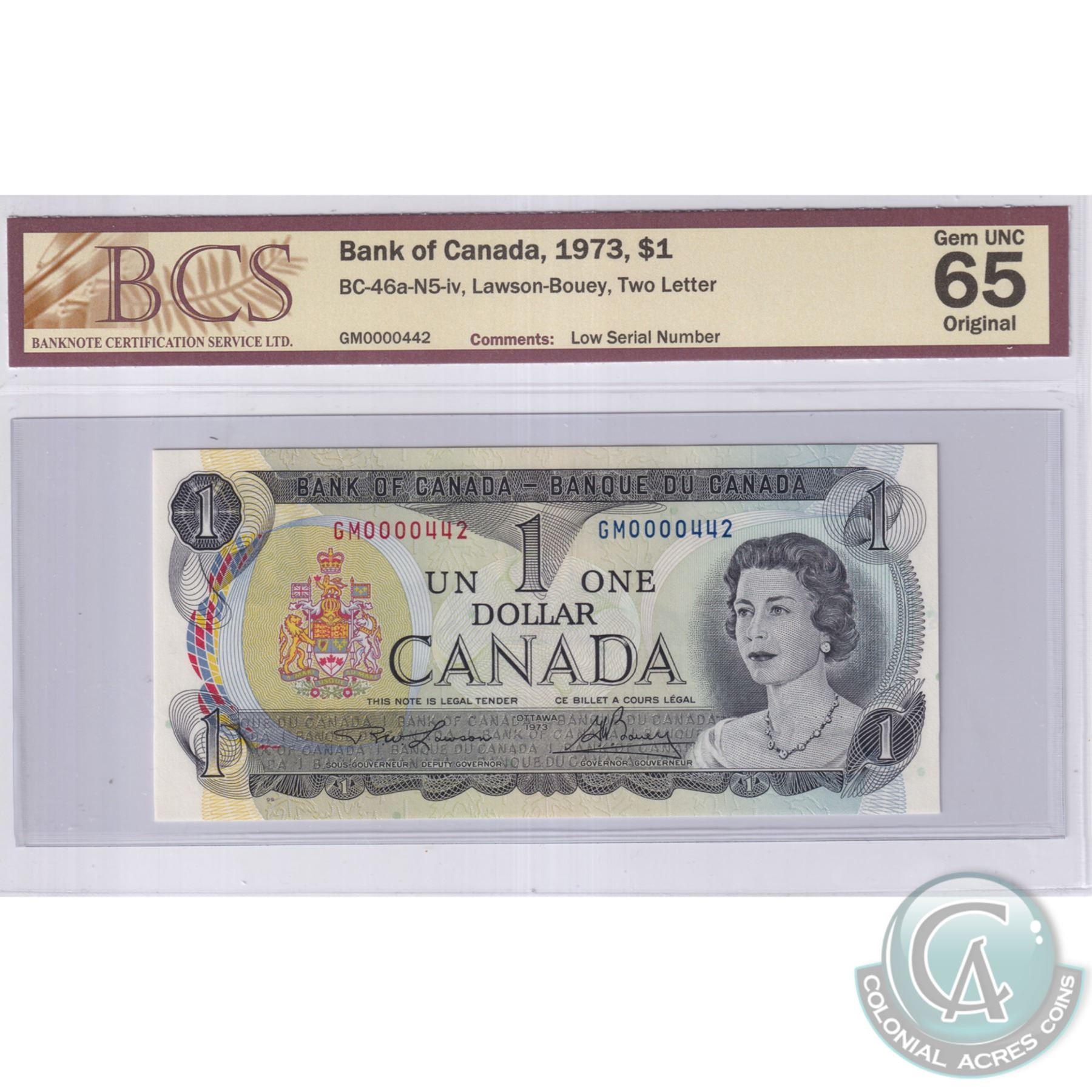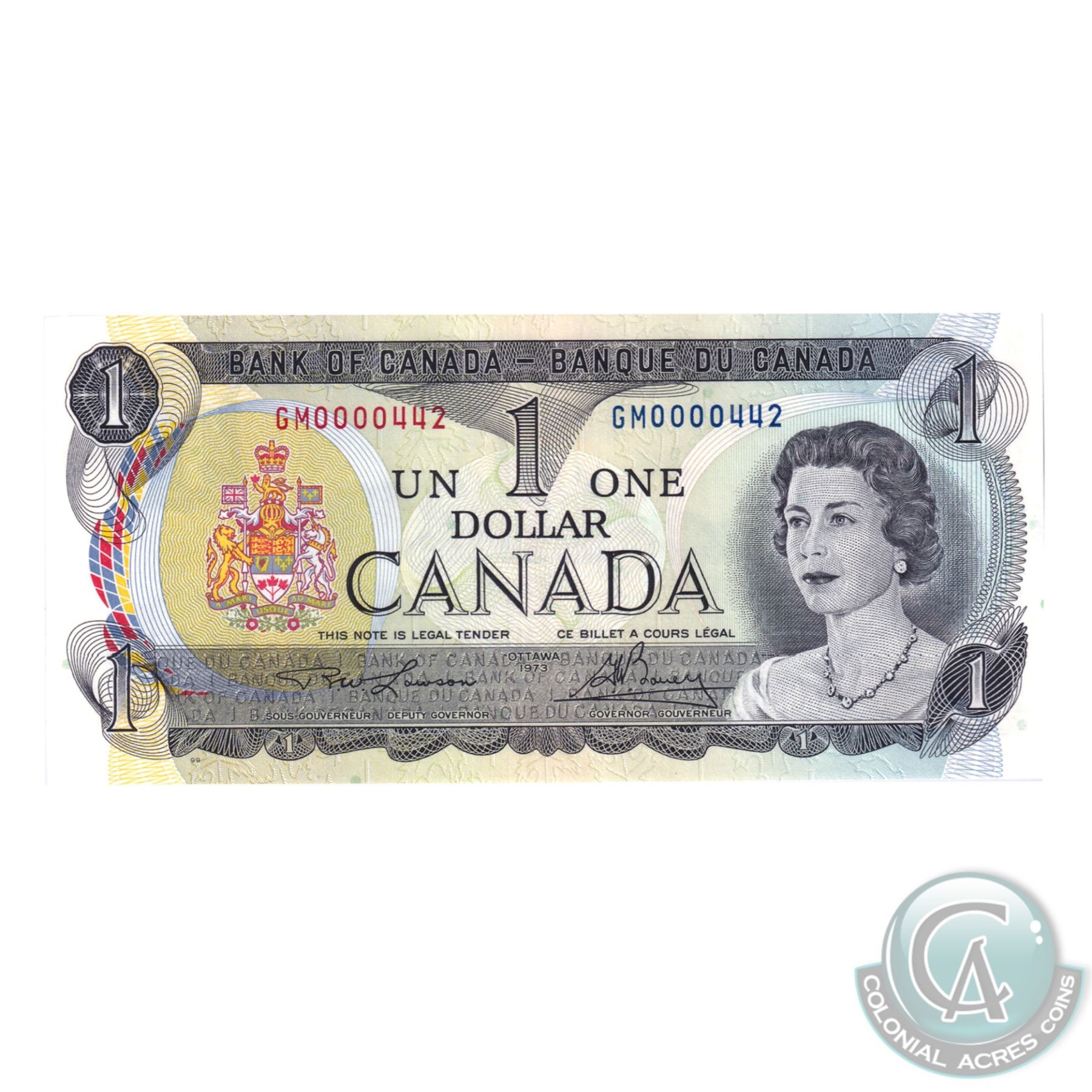 BC-46a-N5-iv 1973 Bank of Canada $1, Lawson-Bouey, Low Serial Number GM0000442, BCS Certified GUNC-65 Original