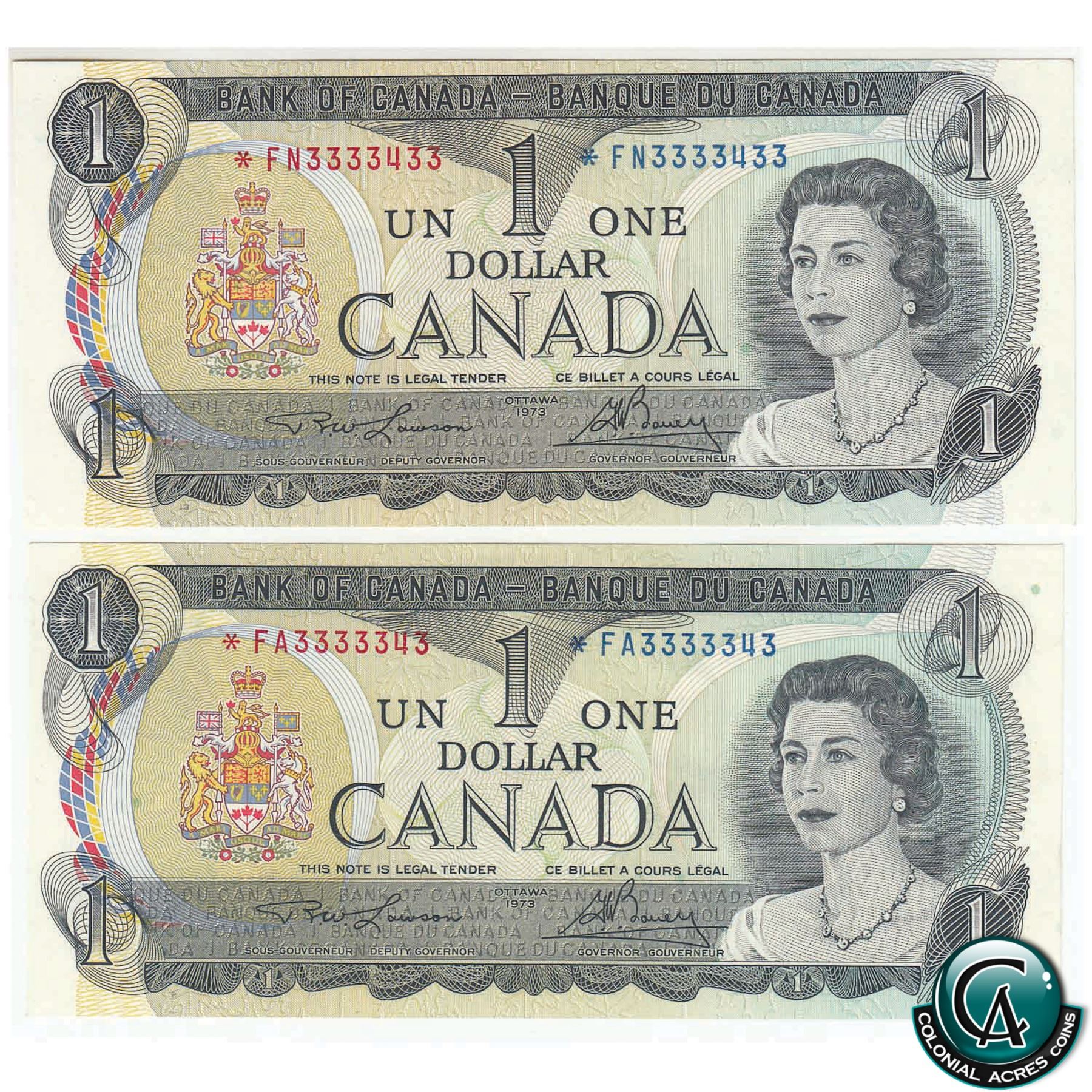 BC-46aA 1973 Bank of Canada $1, 2 Replacement Notes with matching Serial Numbers. *FA & *FN both with S/N: 3333433. Both Notes are CUNC Condition! A Neat Lot!