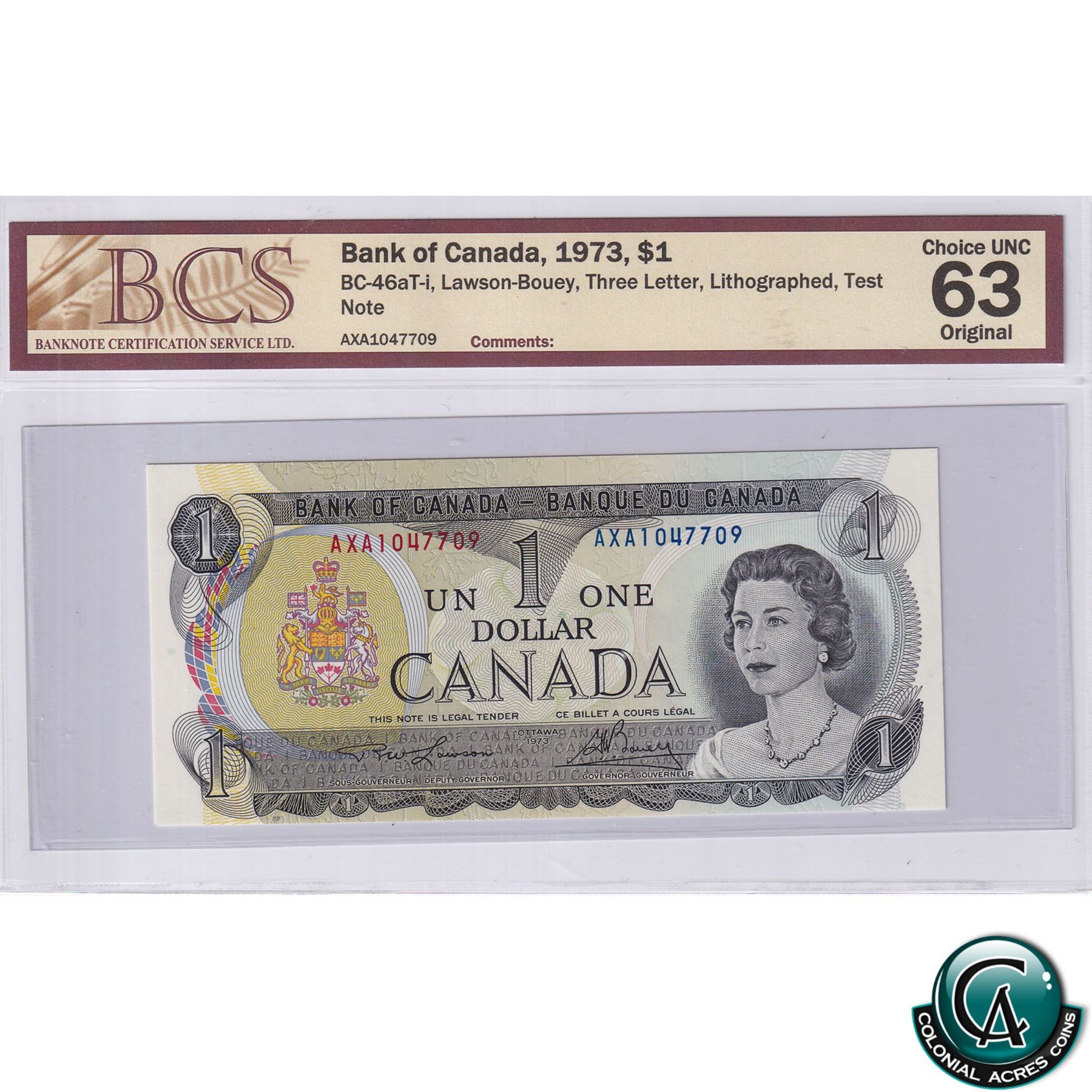 BC-46aT-i 1973 Bank of Canada Test Note $1 Three Letter, Lithographed, Lawson-Bouey, AXA1047709, BCS Certified CUNC-63 Original.