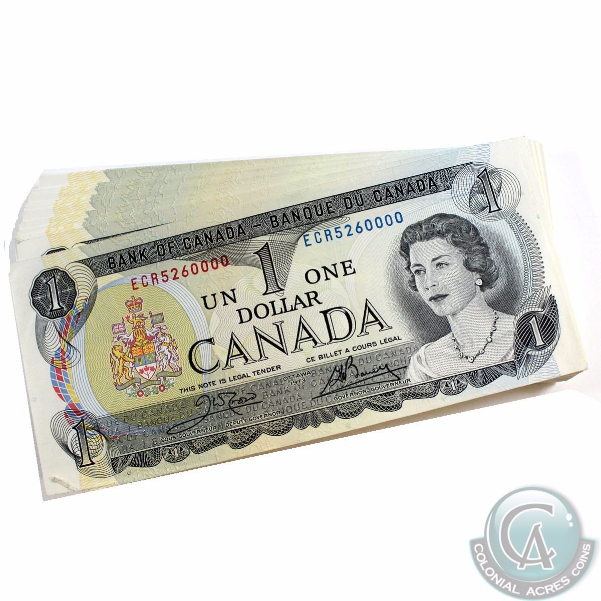 BC-46b. 101 Consecutive 1973 Bank of Canada $1, Crow-Bouey, S/N: ECR5260000-ECR5260100 mostly in UNC Condition. 101 pcs.