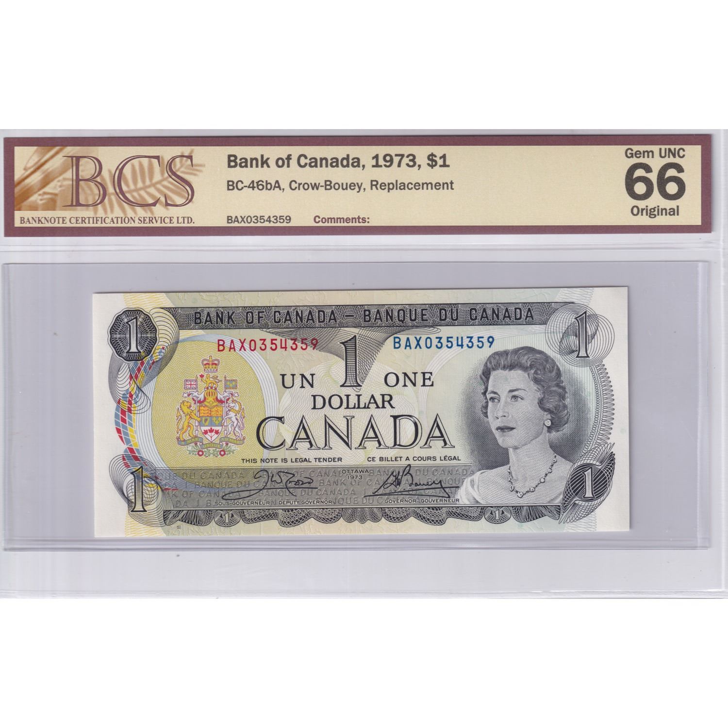 BC-46bA 1973 Bank of Canada $1, Crow-Bouey, Replacement, S/N: BAX0354359, BCS Certified GUNC-66 Original.