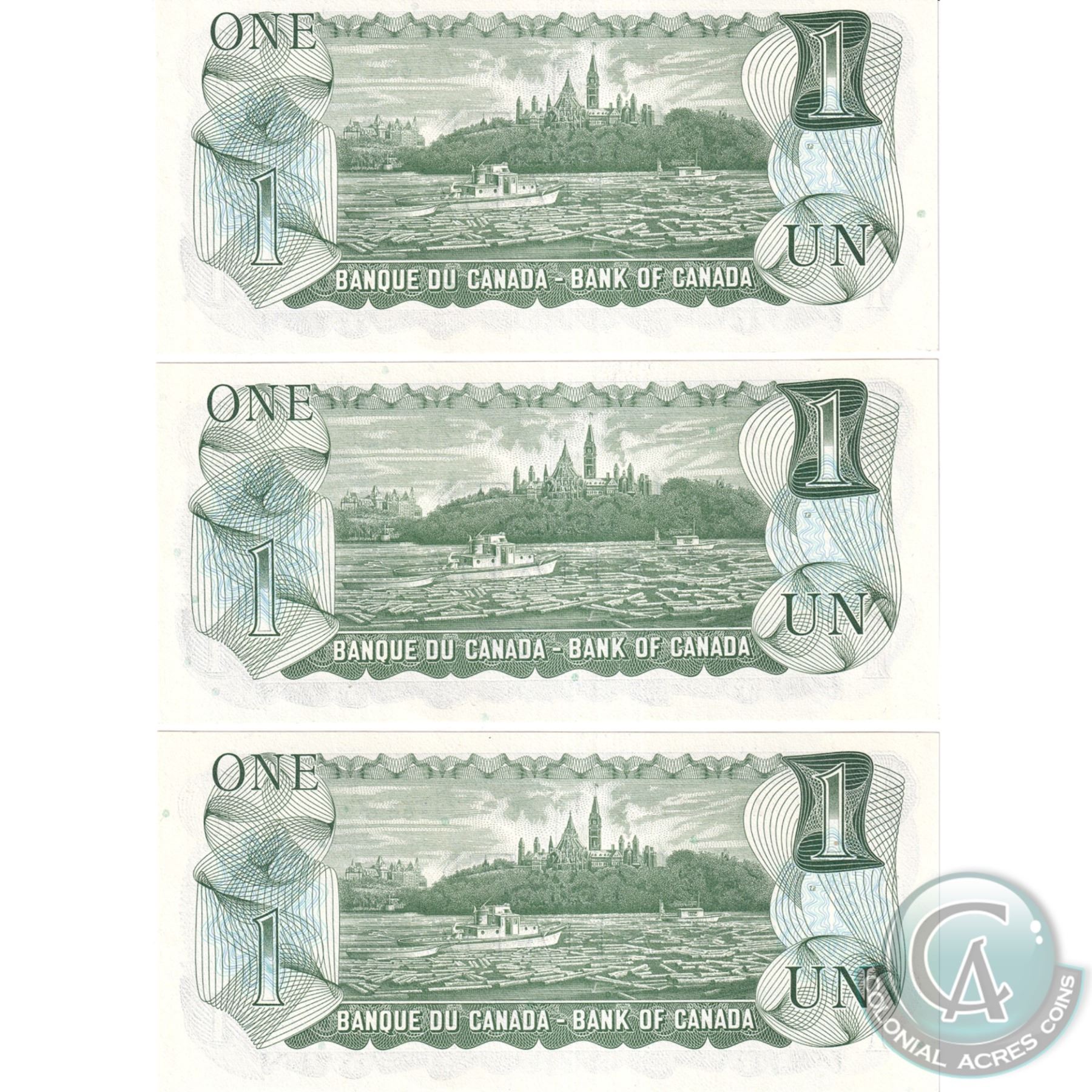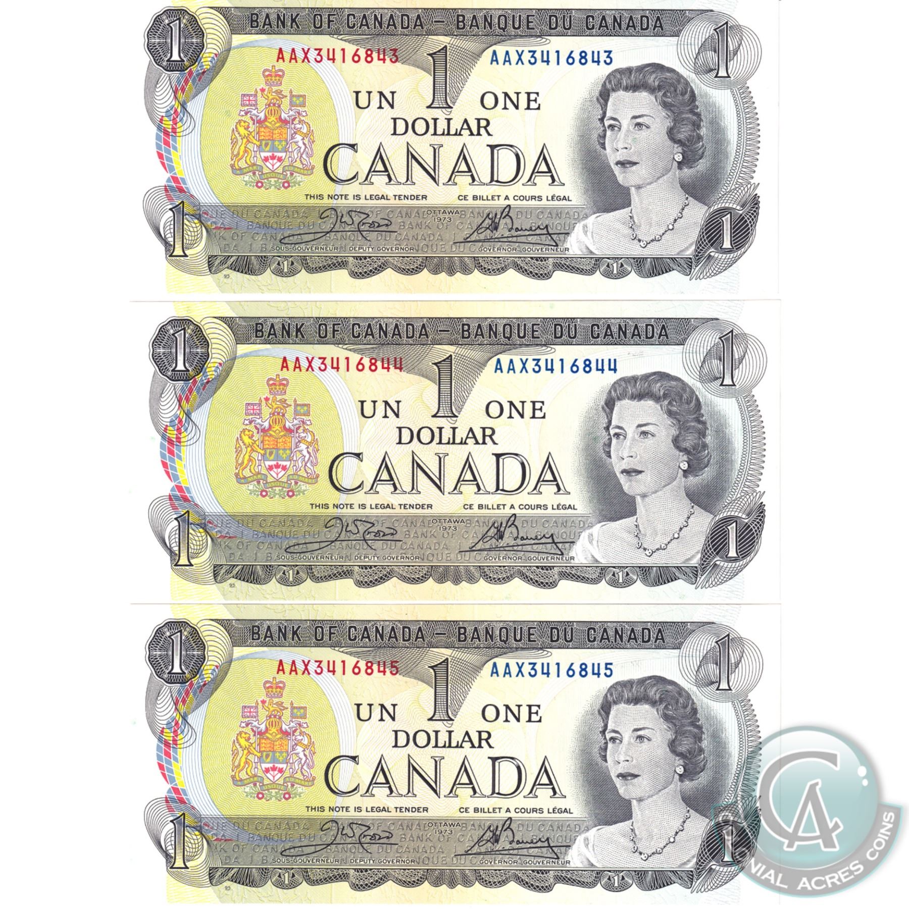 BC-46bA 3 sequential 1973 Bank of Canada Replacement $1, Crow-Bouey S/N: AAX3416843/44/45. CUNC