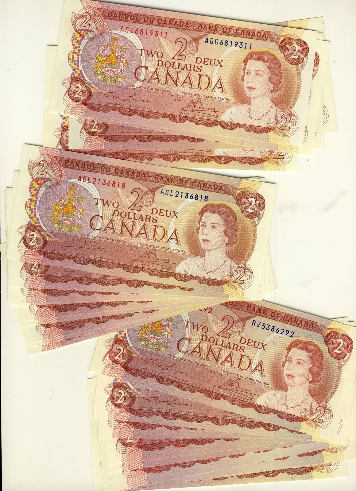 BC-47a(9), BC-47b(12) and BC47a-i(4) 1974 $2. Lot of 25 notes all AU to UNC