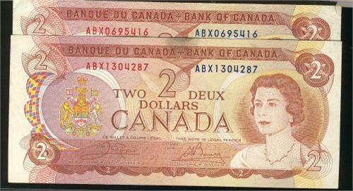 BC-47aAi 1974 $2 Lawson-Bouey ABX0695416 about VF, BC-47bA Crow-Bouey ABX1304287 AU, light stain.