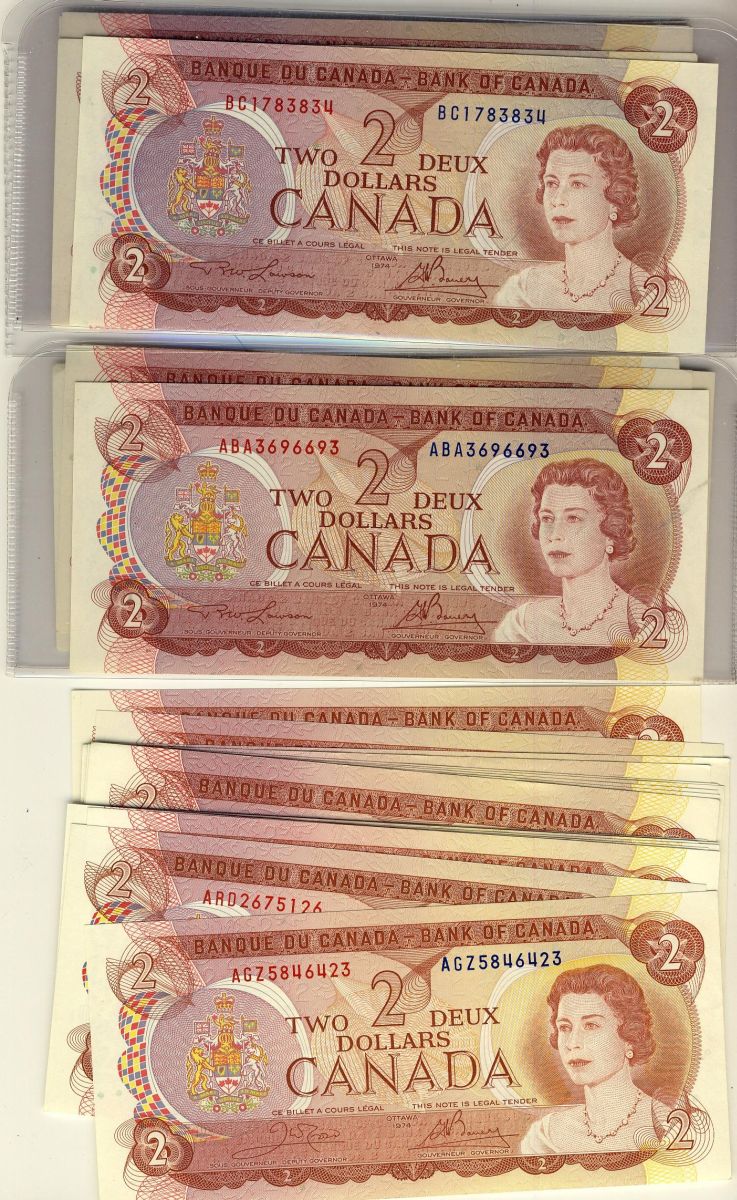 BC-47b 1974 $2. Lot of 55 notes includes various signatures and prefixes. Unc to Gem Unc
